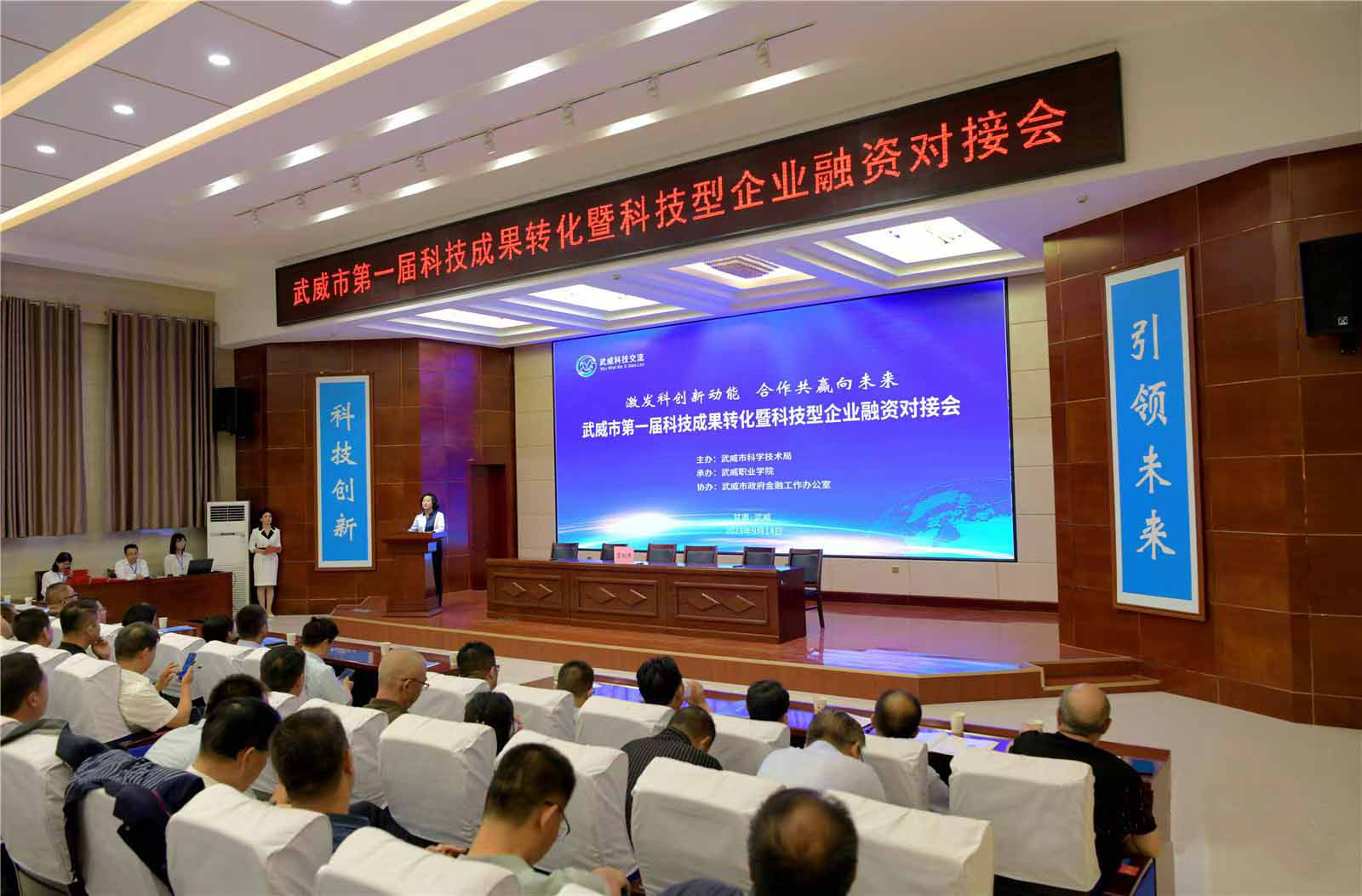 9月14日上午,由武威市科學技術局主辦、我校承辦的武威市第一屆科技成果轉化暨科技型企業(yè)融資對接會在菁英廳成功舉辦,武威市政府黨組成員、副市長柳生墜,武威市科技局黨組書記、局長高小華出席本次會議,縣區(qū)政府分管領導,市直有關單位,有關企業(yè)負責人等共200人參加會議。