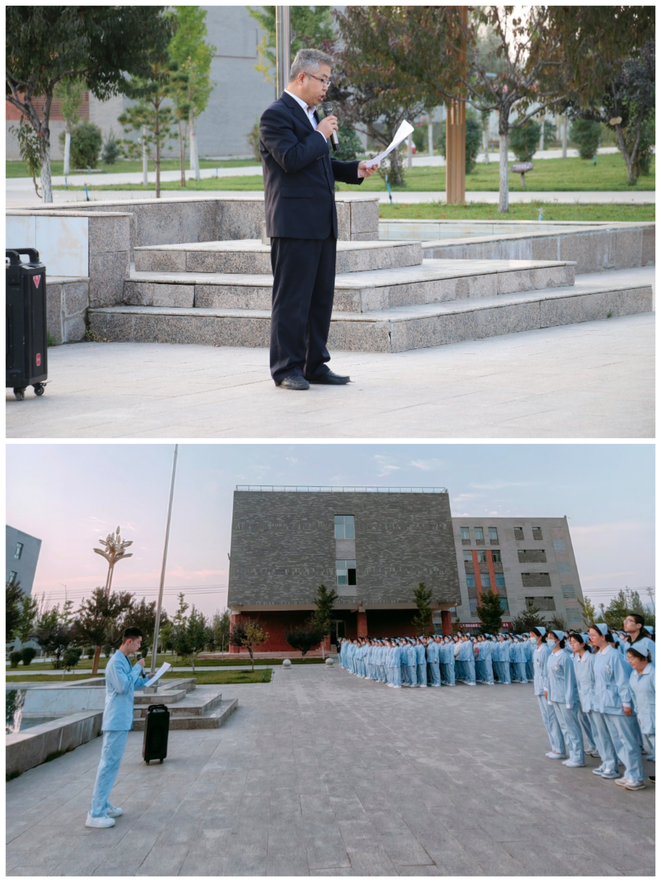 10月9日清晨,護(hù)理學(xué)院在圖書館前廣場(chǎng)舉行升國(guó)旗儀式,學(xué)院黨總支書記張建輝、團(tuán)委書記楊杰、全體班主任及2022、2023級(jí)全體學(xué)生參加此次升旗儀式,儀式由楊杰主持。