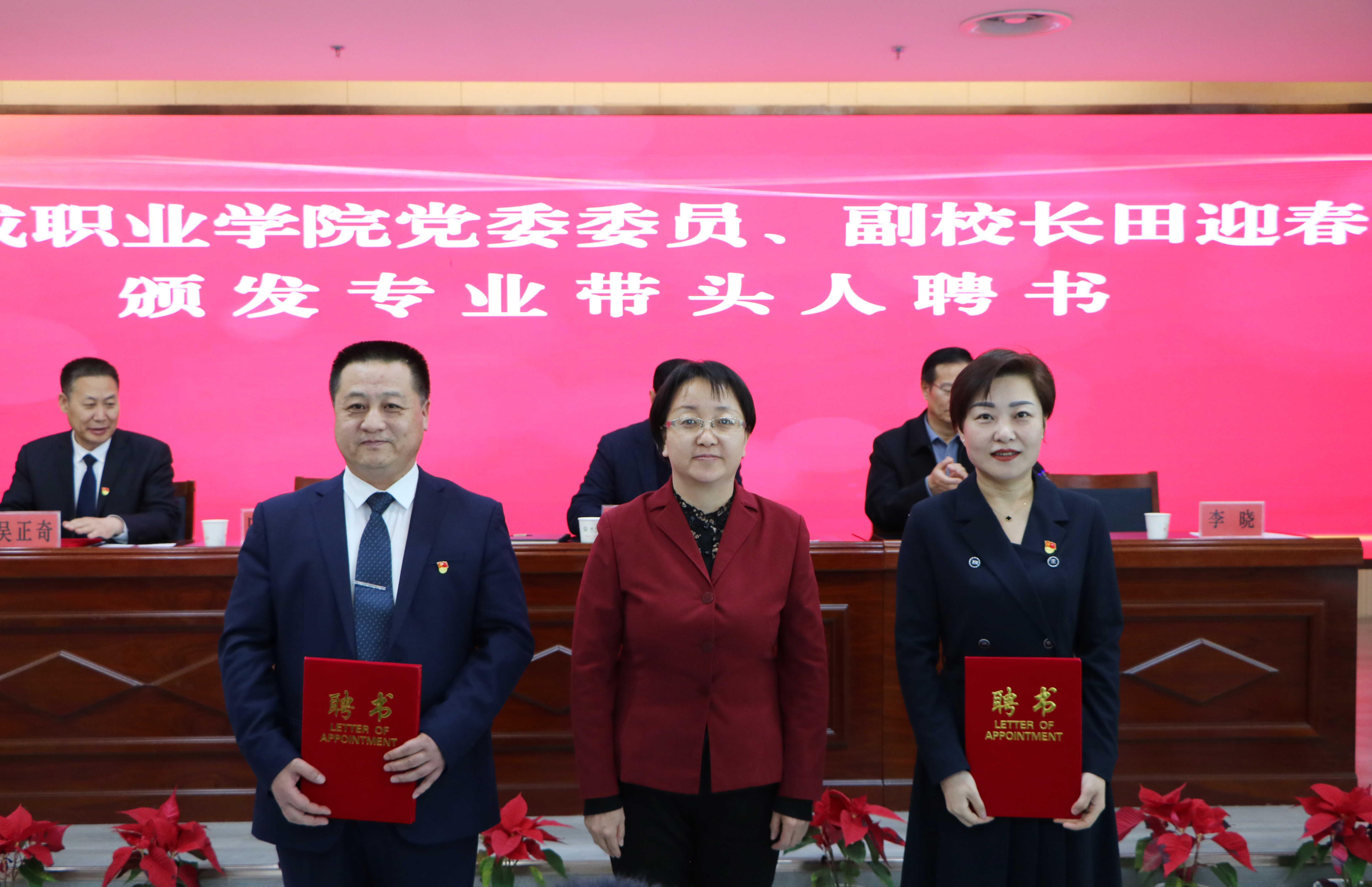 張開禮宣讀了聘任文件。王宏、張開禮和田迎春分別為特聘教授、客座教授和專業(yè)帶頭人頒發(fā)了聘書。