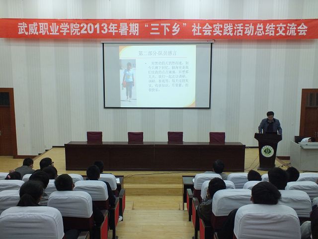 10月14日下午,武威職業(yè)學(xué)院2013年暑期“三下鄉(xiāng)”社會(huì)實(shí)踐活動(dòng)總結(jié)交流會(huì)在東階梯教室舉行,學(xué)院團(tuán)委負(fù)責(zé)人及各實(shí)踐團(tuán)隊(duì)成員和新生團(tuán)學(xué)干部代表共300人參加了交流會(huì)。