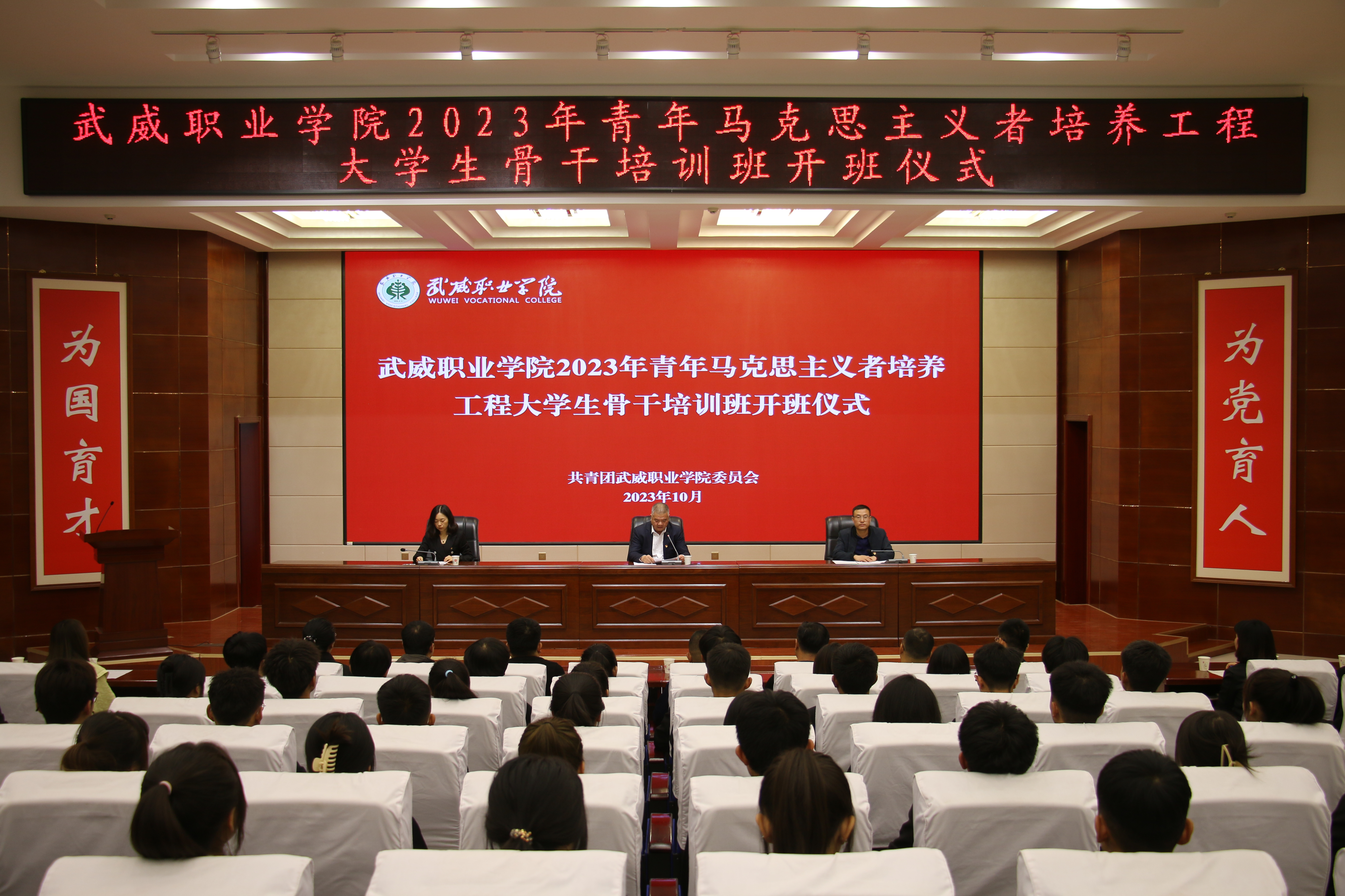 10月9日下午,學(xué)校2023年青年馬克思主義者培養(yǎng)工程大學(xué)生骨干培訓(xùn)班在菁英廳舉行開(kāi)班儀式。學(xué)校黨委委員、副校長(zhǎng)王守云出席開(kāi)班儀式并講話,校團(tuán)委全體干部、二級(jí)學(xué)院團(tuán)委書(shū)記、青馬班培訓(xùn)學(xué)員110人參加開(kāi)班儀式。儀式由校團(tuán)委書(shū)記高鵬堂主持。