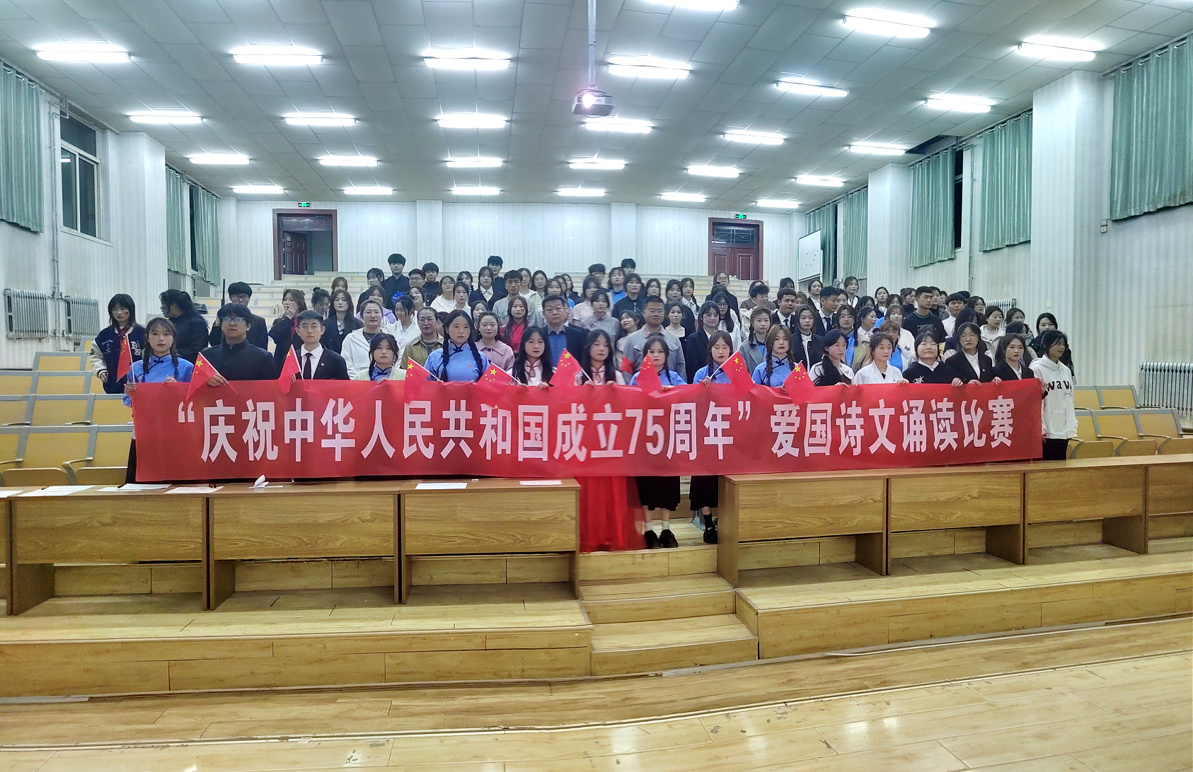 為慶祝中華人民共和國(guó)成立75周年,3月28日,藥學(xué)院在正德廳舉行了以“慶祝中華人民共和國(guó)成立75周年”為主題的愛國(guó)詩文誦讀比賽。全院共13個(gè)參賽隊(duì)參加,藥學(xué)院學(xué)生工作負(fù)責(zé)人魏曙光、團(tuán)委書記楊琨、輔導(dǎo)員魯倩林、全體班主任及150余名學(xué)生代表共同觀看了比賽。