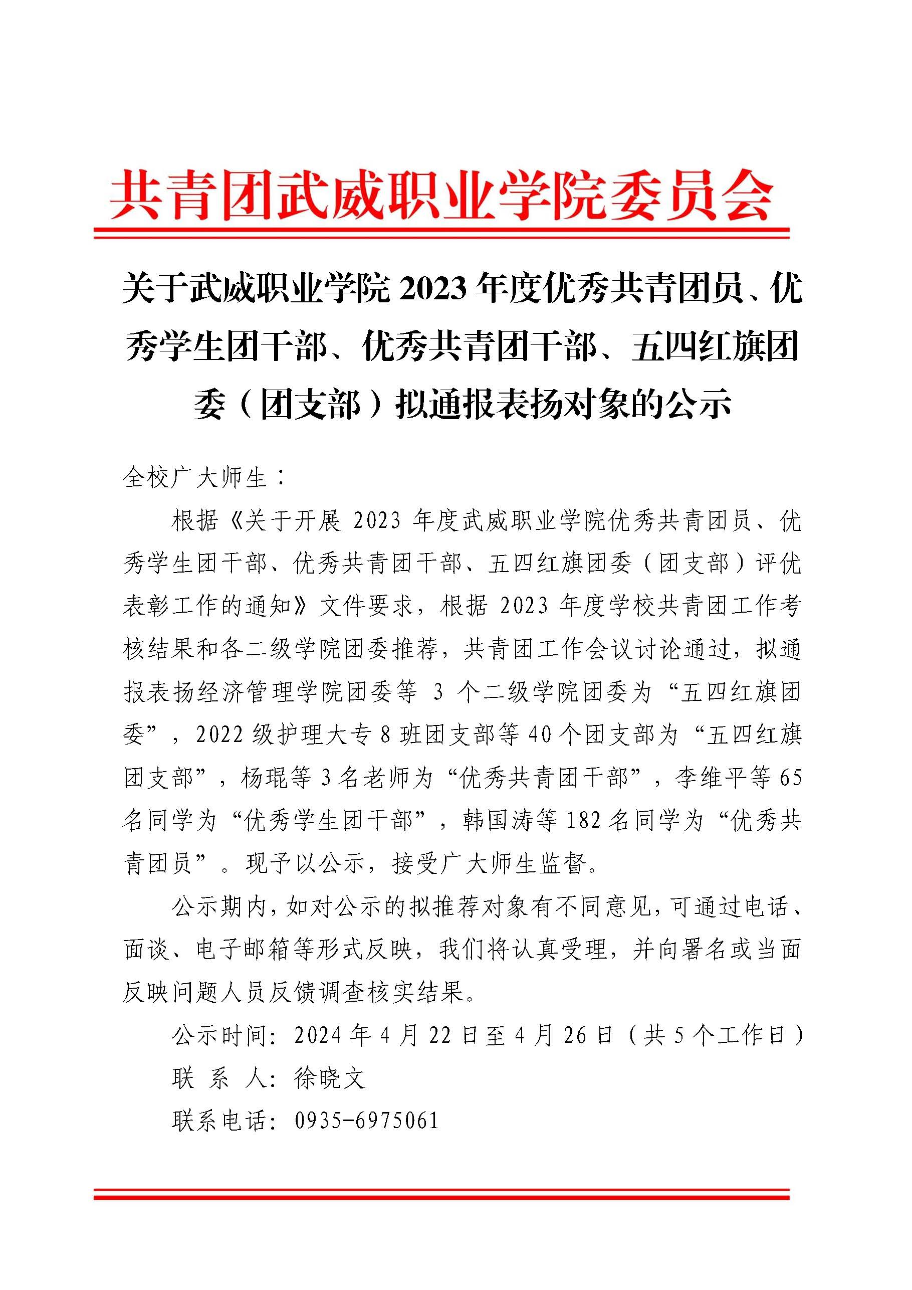 關(guān)于武威職業(yè)學(xué)院2023年度優(yōu)秀共青團(tuán)員、優(yōu)秀學(xué)生團(tuán)干部、優(yōu)秀共青團(tuán)干部、五四紅旗團(tuán)委(團(tuán)支部)擬通報(bào)表揚(yáng)對象的公示