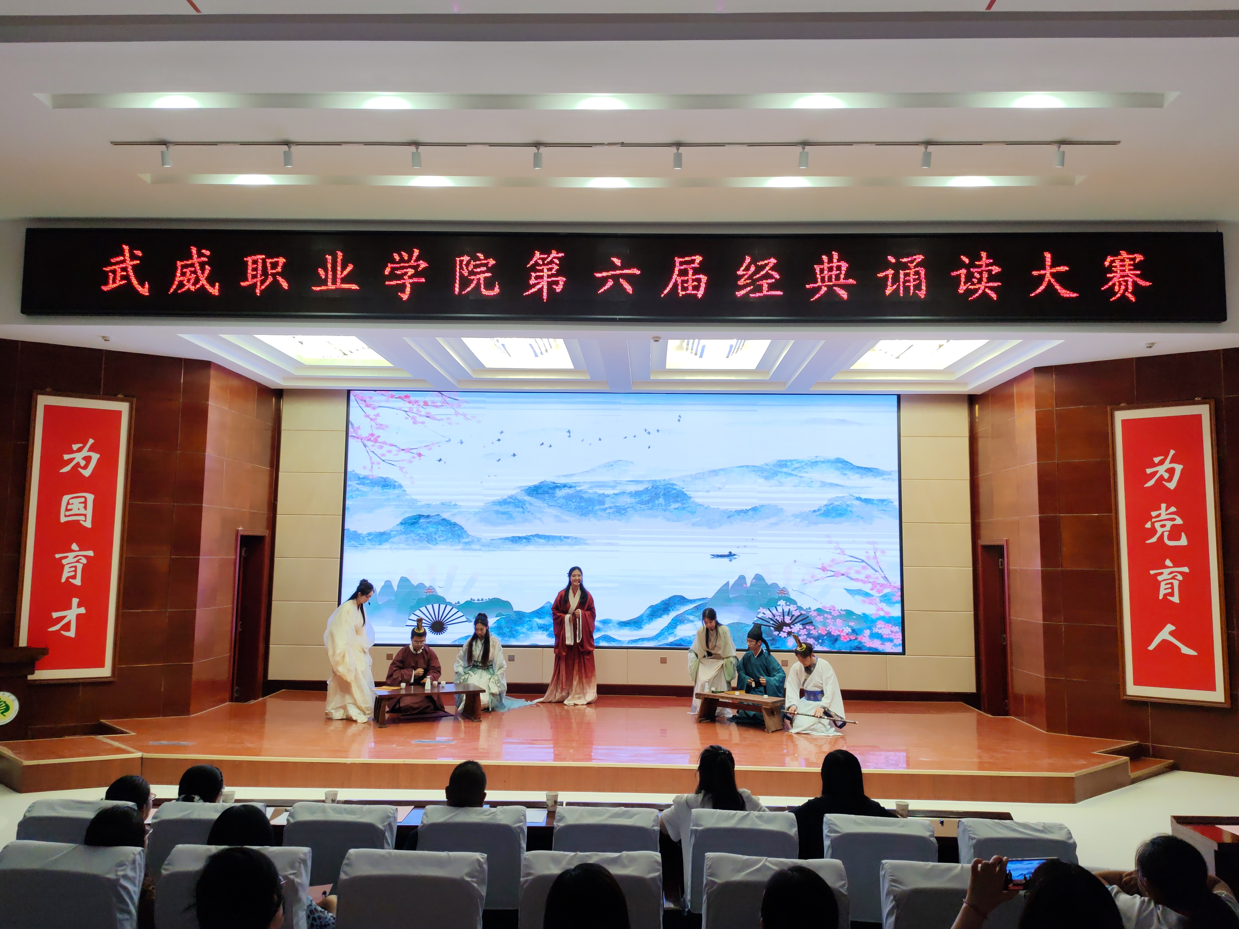 為深化全民閱讀活動(dòng)開展,引領(lǐng)社會(huì)大眾親近中華經(jīng)典,傳承弘揚(yáng)中華優(yōu)秀文化,齊心共書強(qiáng)國新篇章,武威職業(yè)學(xué)院第六屆經(jīng)典誦讀大賽于6月4日在菁英廳成功舉辦。黨委委員、副校長田迎春,科研處處長蔡柱山出席比賽現(xiàn)場,邀請(qǐng)語言文字專業(yè)5位評(píng)委為教師組、學(xué)生組、留學(xué)生組共20件參賽作品進(jìn)行現(xiàn)場評(píng)分。