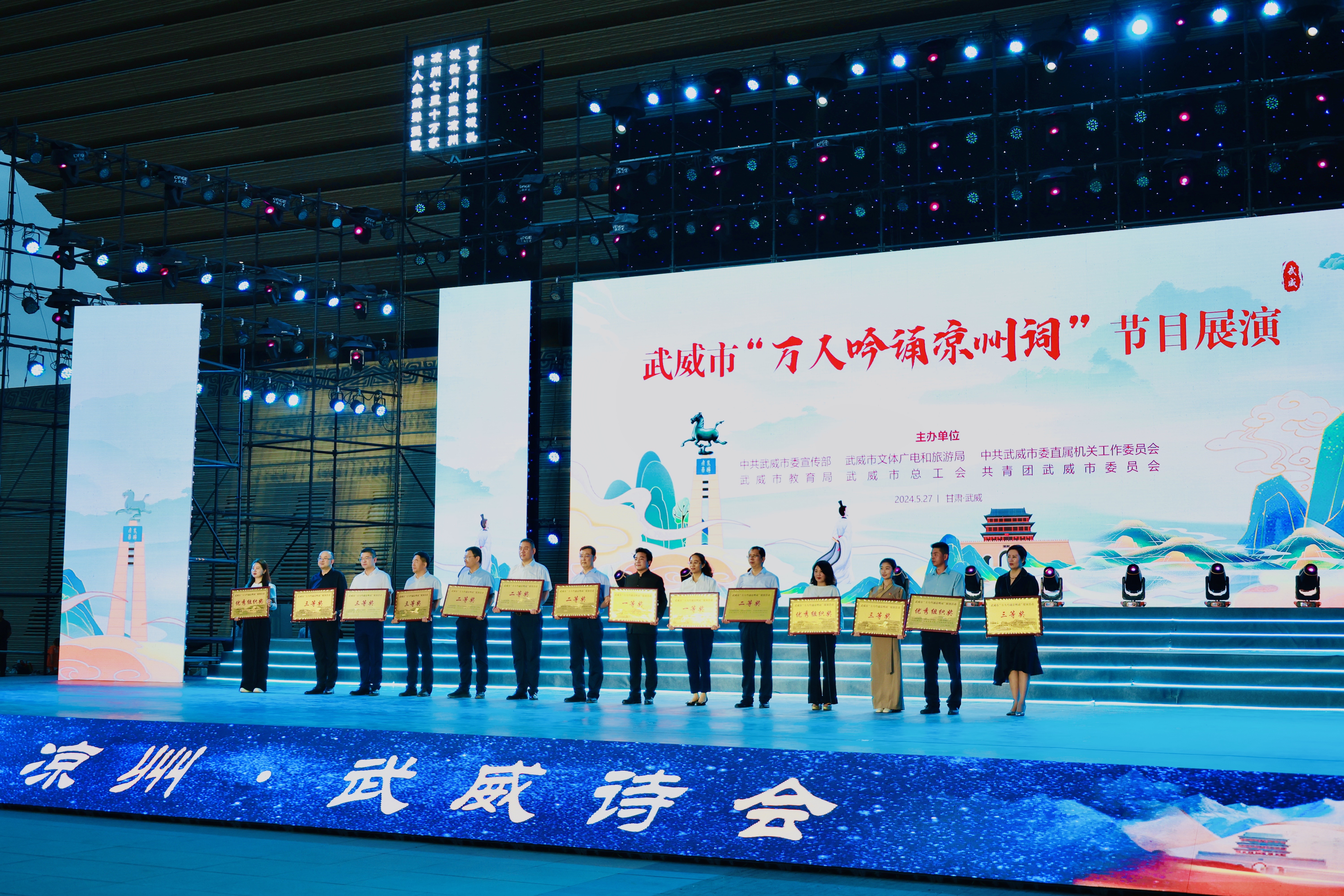 5月27日晚,武威市“萬人吟誦涼州詞”優(yōu)秀節(jié)目展演活動在漢唐天馬城大漢賦館前舉行,并為“萬人吟誦涼州詞”比賽中的優(yōu)秀作品頒獎。學(xué)校選送的節(jié)目《詩意涼州·迤邐踏歌》在15個展演節(jié)目中榮獲一等獎。