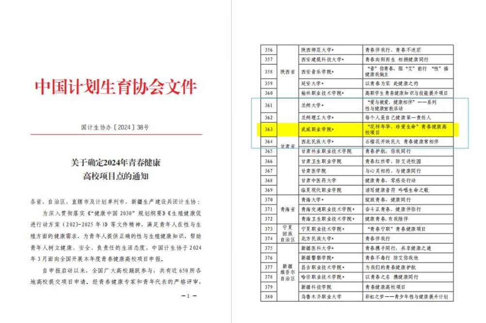 日前,中國(guó)計(jì)劃生育協(xié)會(huì)發(fā)布《關(guān)于確定2024年青春健康高校項(xiàng)目點(diǎn)的通知》,我校學(xué)生工作部、校團(tuán)委、護(hù)理學(xué)院共同申報(bào)的“花樣年華,珍愛(ài)生命”項(xiàng)目,從全國(guó)各地500余所高校中脫穎而出,自2022年以來(lái)連續(xù)三次成功中標(biāo)中國(guó)計(jì)生協(xié)專項(xiàng)資助A類項(xiàng)目,成為甘肅省中標(biāo)A類項(xiàng)目院校中唯一一所高職院校。