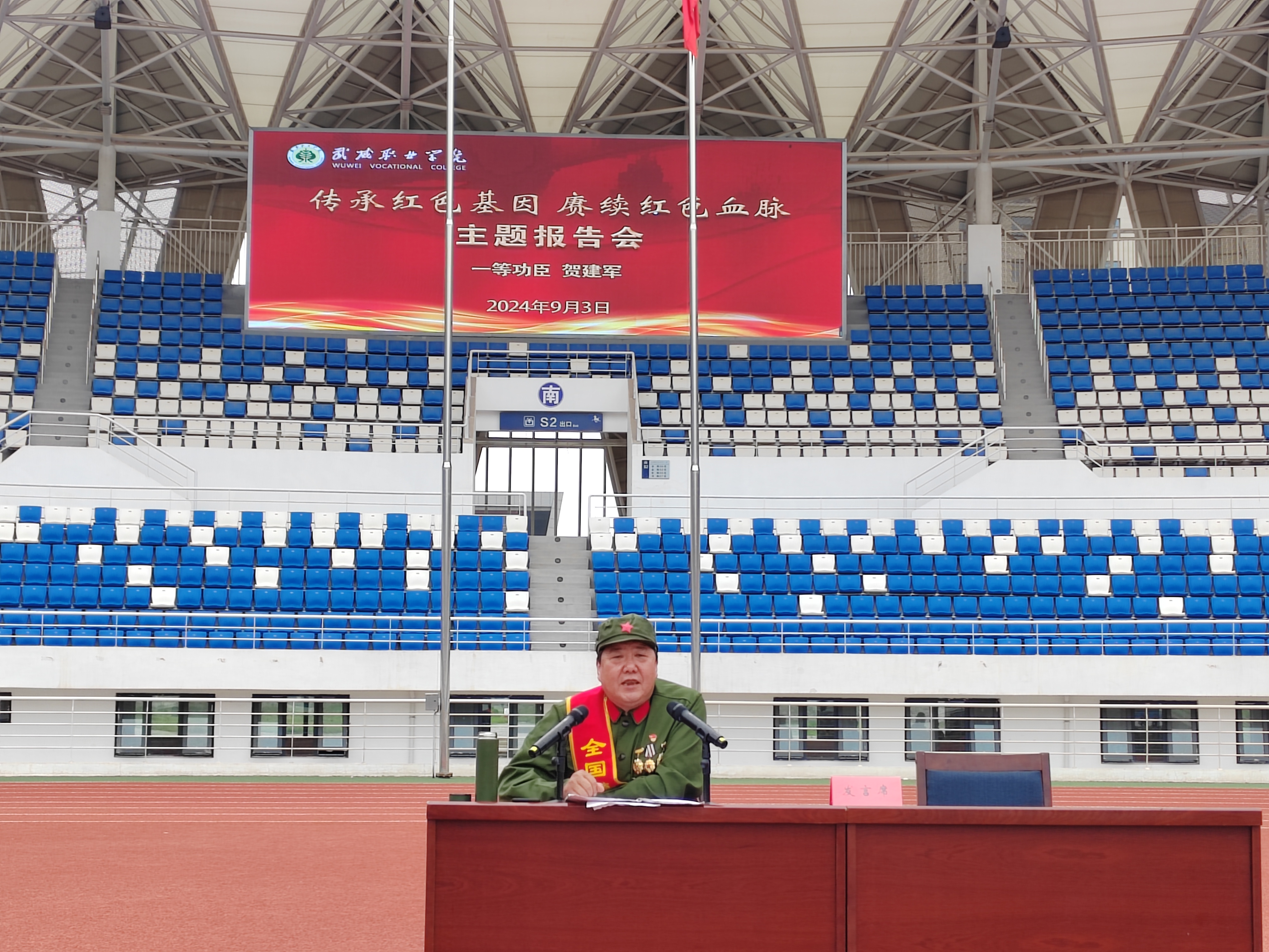 天地英雄氣,千秋尚凜然。為進(jìn)一步傳承紅色基因、弘揚(yáng)革命精神,培養(yǎng)大學(xué)生強(qiáng)烈的國防意識(shí)和國防觀念,充分激發(fā)2024級(jí)新生參加軍訓(xùn)的熱情和投身國防建設(shè)的使命感與責(zé)任感,9月3日上午,學(xué)校邀請(qǐng)?jiān)颇线吘车貐^(qū)“老山防御作戰(zhàn)”參戰(zhàn)老兵、“一等戰(zhàn)功”英雄模范、“全國模范退役軍人”賀建軍同志開展了主題為“傳承紅色基因,賡續(xù)紅色血脈”的國防教育宣講會(huì)。