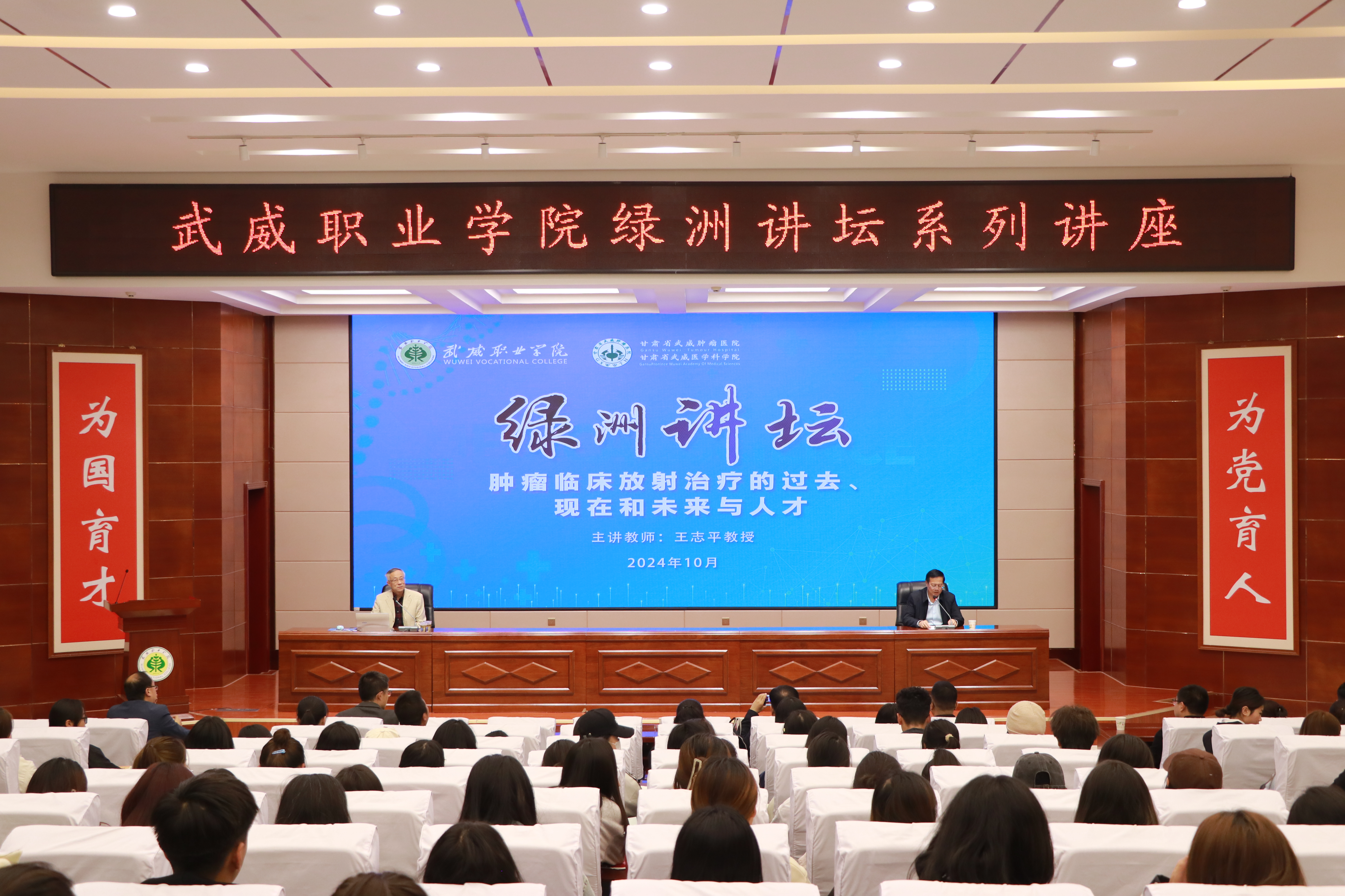 報(bào)告會(huì)由學(xué)校校長、黨委副書記張開禮主持,特邀蘭州大學(xué)第二醫(yī)院王志平教授作了“腫瘤臨床放射治療的過去、現(xiàn)在和未來與人才”的主題講座,甘肅省武威醫(yī)學(xué)科學(xué)院腫瘤醫(yī)院醫(yī)護(hù)人員代表、蘭州大學(xué)實(shí)習(xí)生代表和學(xué)校師生代表共計(jì)220余人參加了報(bào)告會(huì)。
