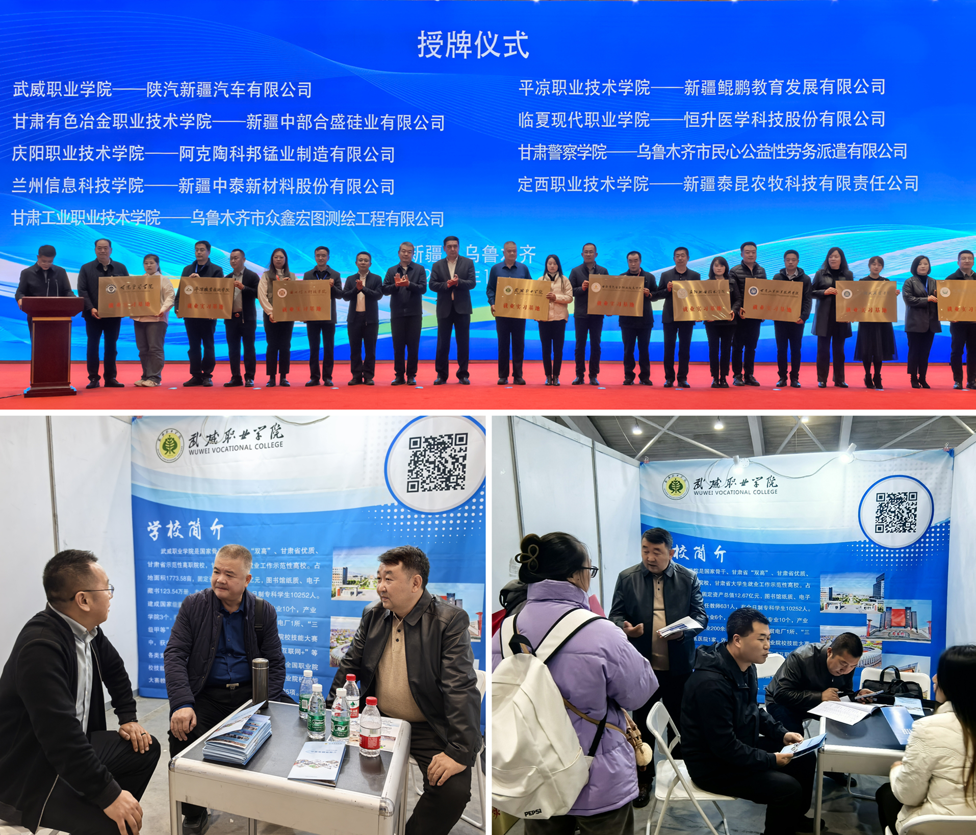 11月1日,召開了甘肅省2025屆畢業(yè)生推介會暨供需對接“政校企”合作座談會、甘青新蒙四省(區(qū))八市(州盟)“紅石榴促就業(yè)”訪企拓崗座談會,30余家企事業(yè)單位與學(xué)校就人才招聘、校企合作等方面的內(nèi)容進(jìn)行了深入交流。在“政校企”合作座談會上,王守云為陜汽新疆汽車有限公司授予武威職業(yè)學(xué)院實習(xí)就業(yè)基地牌匾。