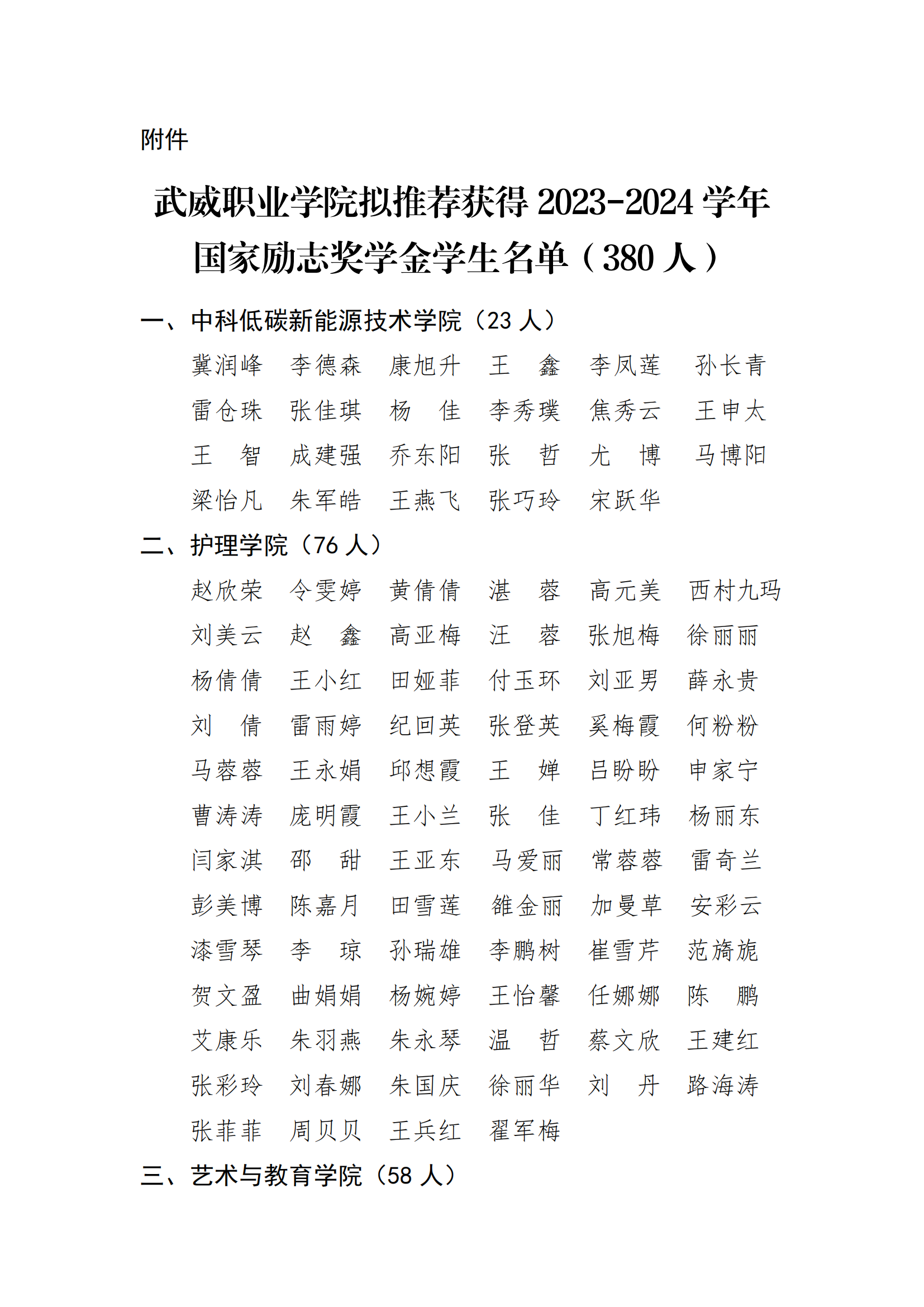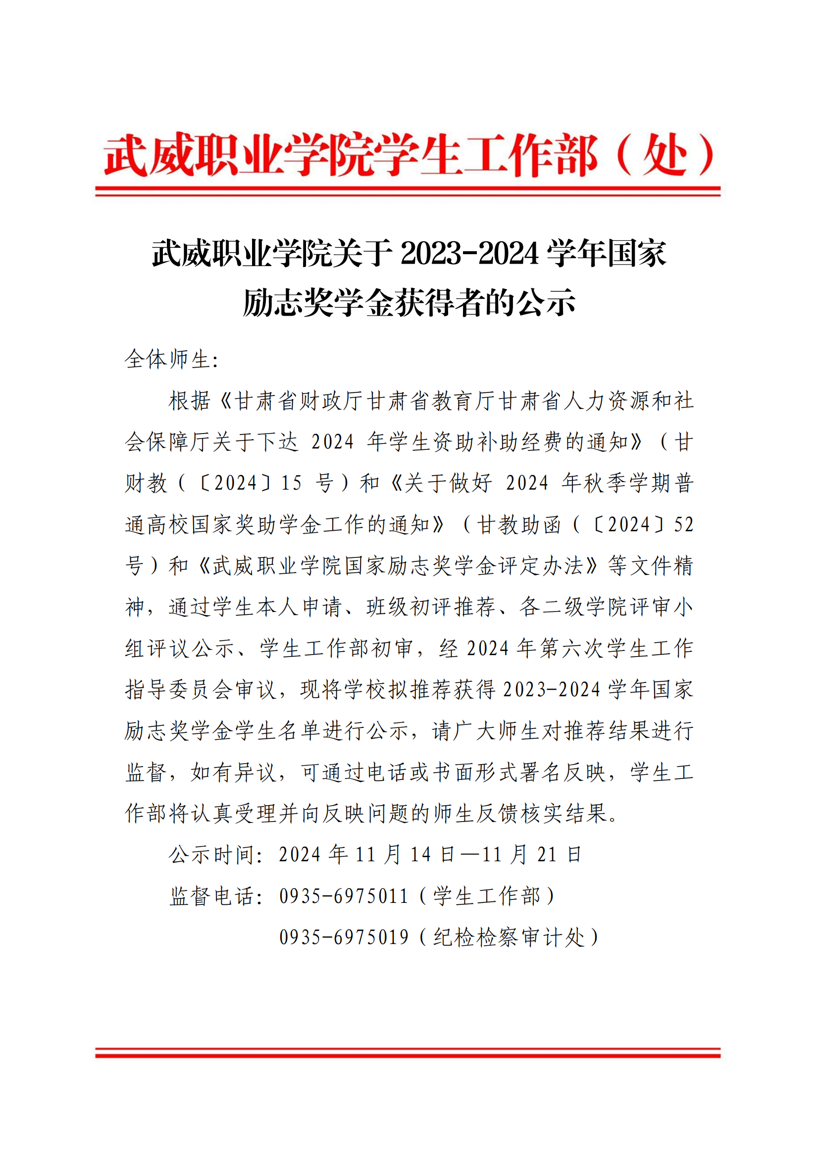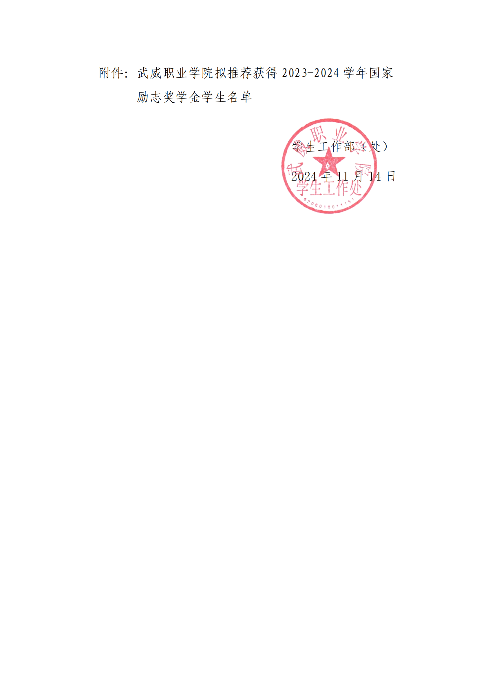 武威職業(yè)學(xué)院關(guān)于2023-2024學(xué)年國家勵志獎學(xué)金候選人的公示