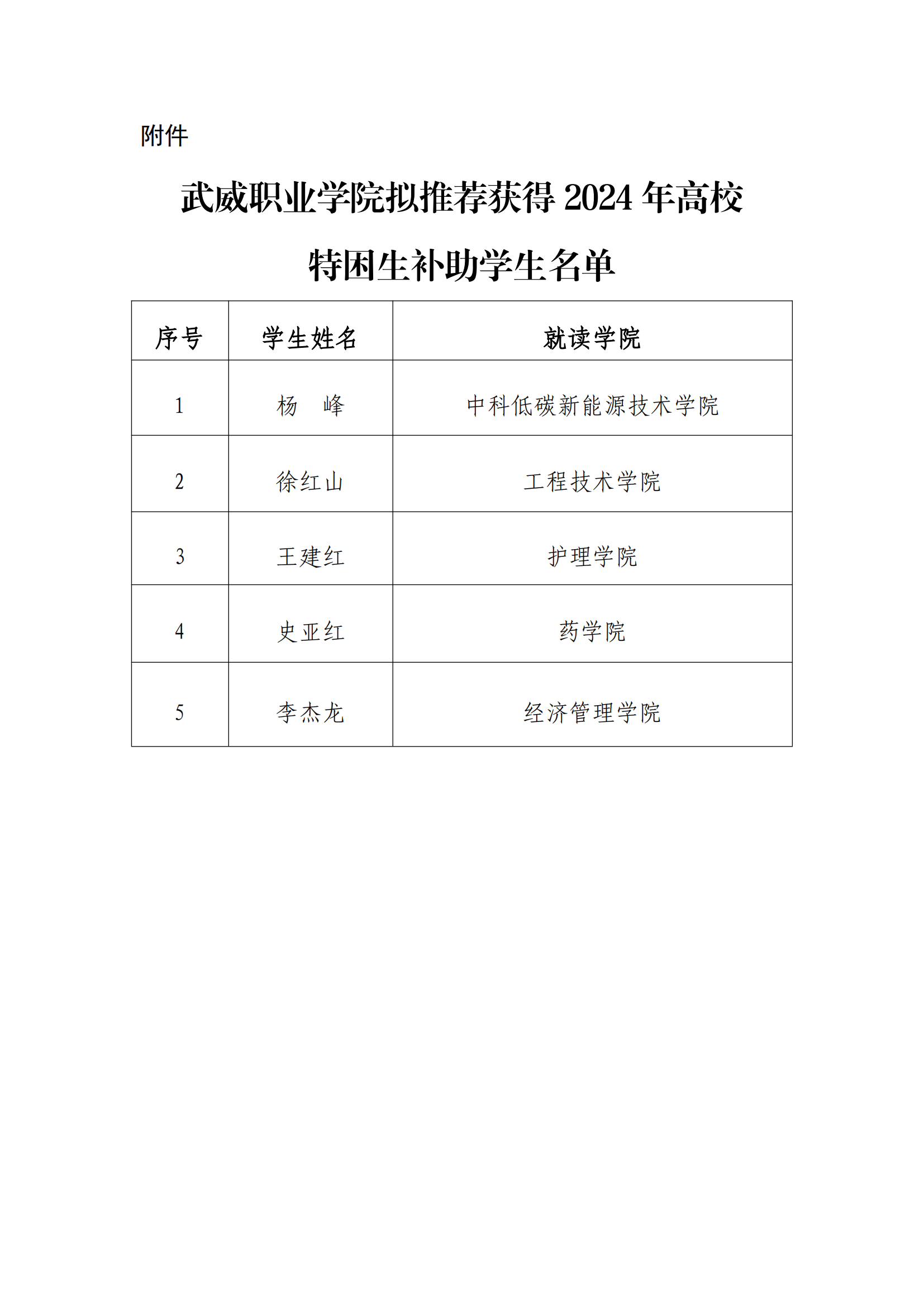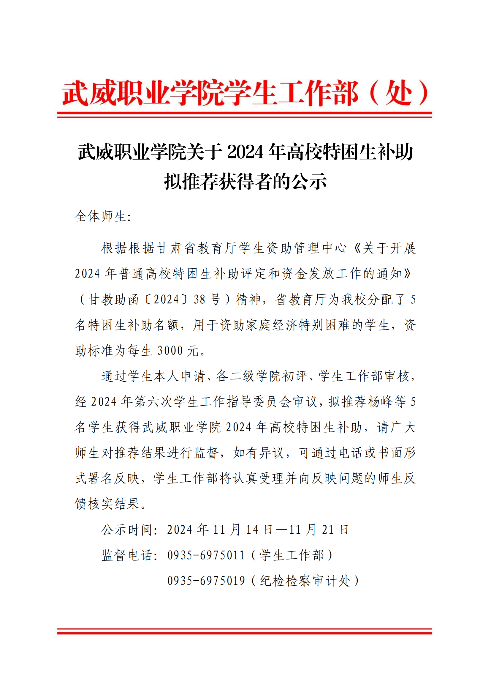 武威職業(yè)學(xué)院2024年高校特困生補助獲得者公示