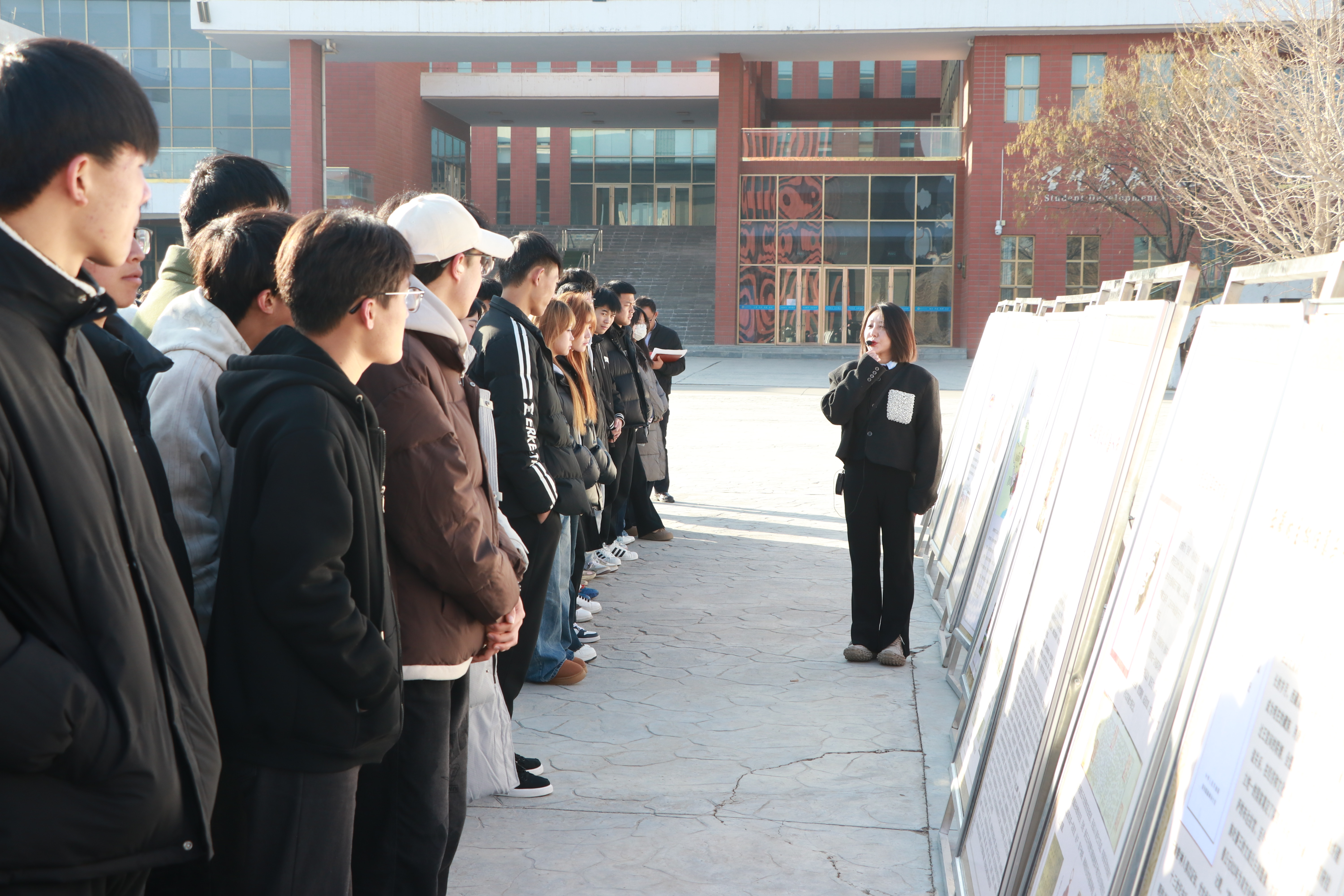 在學(xué)生發(fā)展中心前廣場,同學(xué)們現(xiàn)場參觀了民族文化宣傳展板,二十余塊展板圖文并茂生動展現(xiàn)了涼州會盟的歷史背景和意義,展示了新時代武威市在民族團結(jié)進步方面的壯闊歷程和取得的豐碩成果。武威市涼州會盟紀(jì)念館講解員楊琪以涼州會盟歷史為線,現(xiàn)場向大家講解了民族團結(jié)故事。