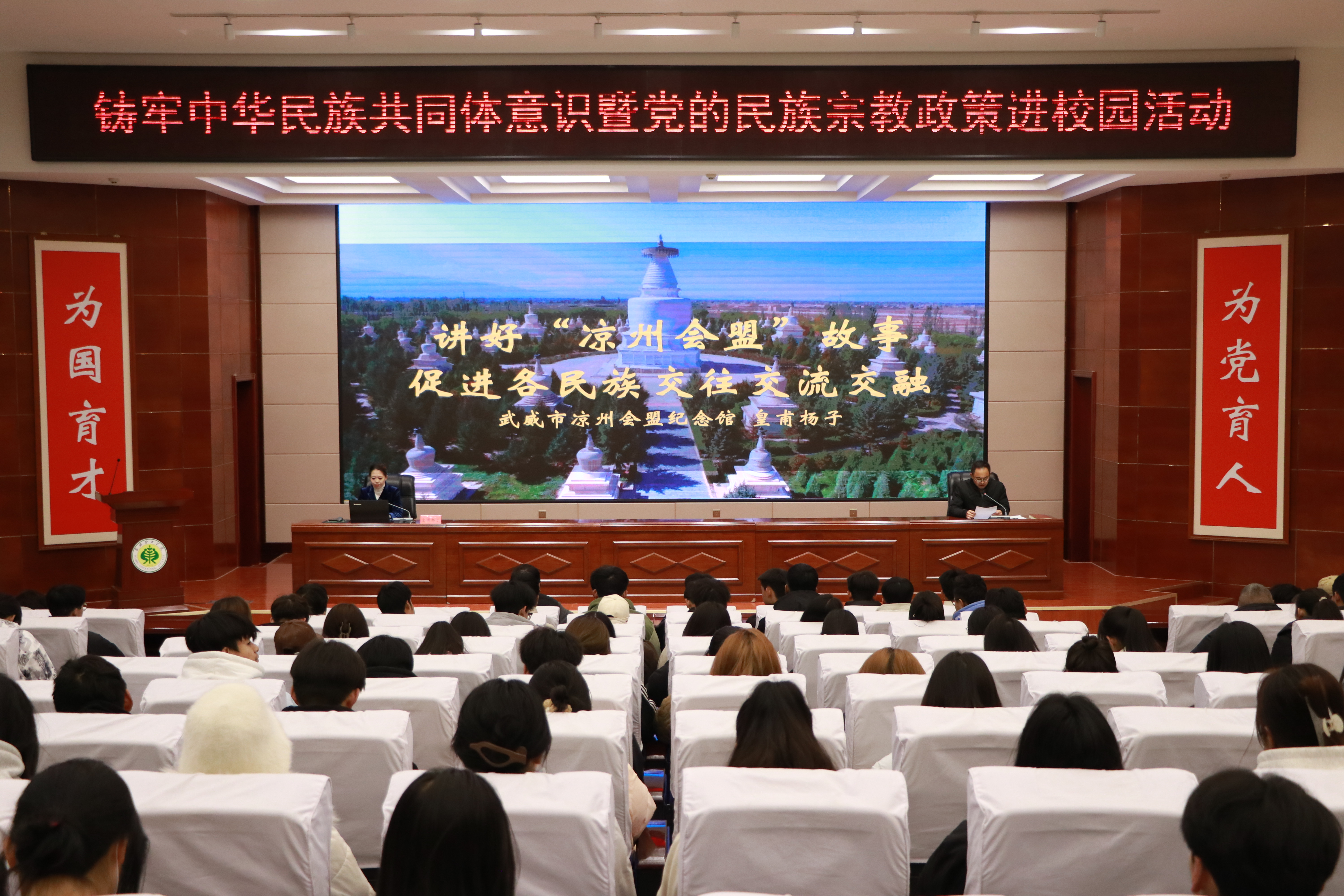 參觀活動后,武威市鑄牢中華民族共同體意識“紅石榴”宣講員皇甫楊子在學(xué)校菁英廳以《講好涼州會盟故事 促進各民族交流交融》為題開展了主題講座。她通過生動的案例和富有感染力的語言,深入剖析涼州會盟的歷史背景、文化意義以及對當(dāng)代民族團結(jié)的啟示,引導(dǎo)同學(xué)們深刻感知中華民族多元一體格局的優(yōu)越性,增強對中華民族大家庭的認同感和歸屬感。