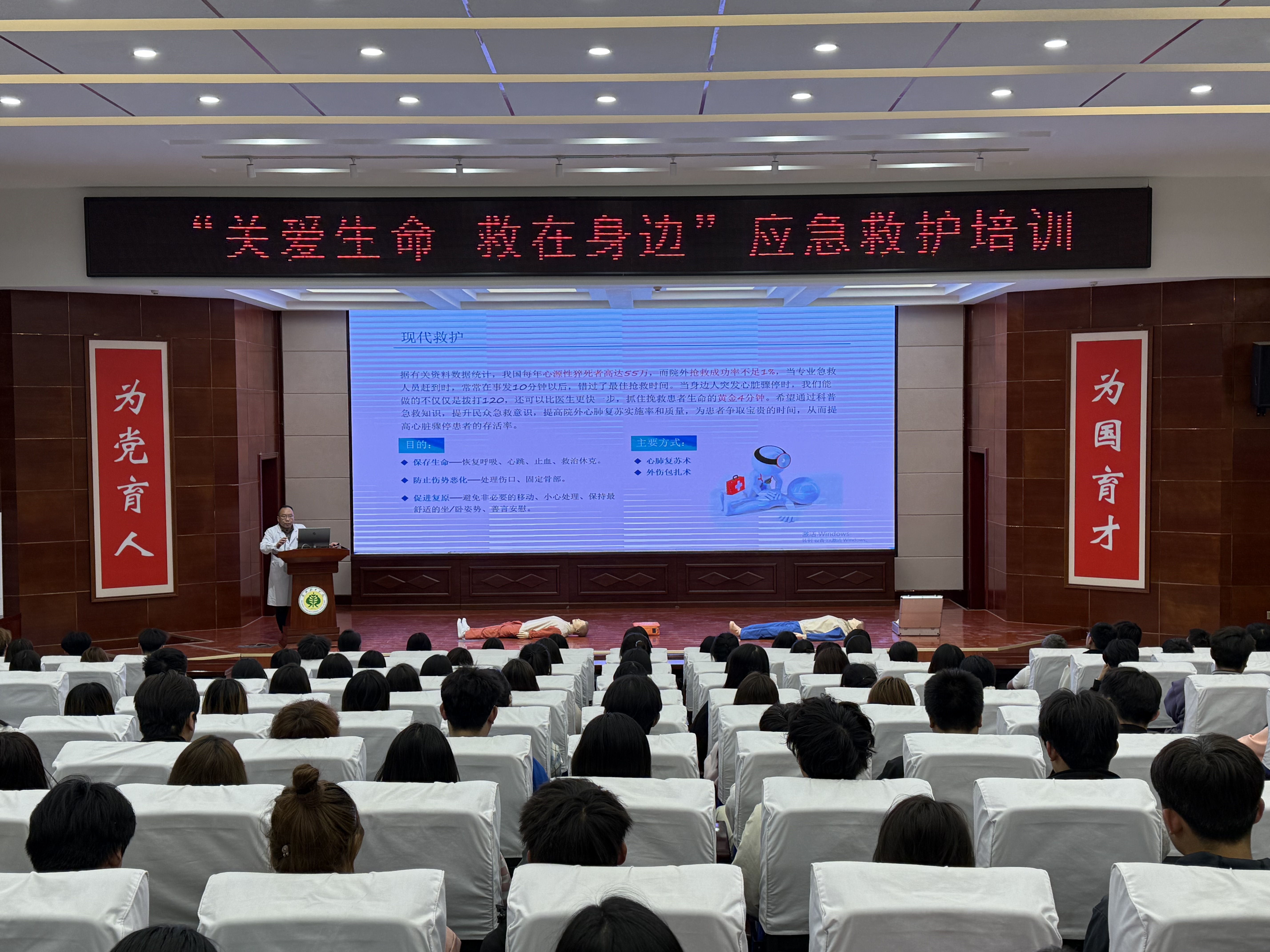 在理論環(huán)節(jié),武威市人民醫(yī)院急診科劉主任圍繞現(xiàn)代救護理念展開講解,重點強調(diào)“黃金4分鐘”在心肺復蘇中的關鍵作用,并詳細解讀心肺復蘇(CPR)操作流程、AED使用規(guī)范、海姆立克急救法及創(chuàng)傷救護技術(shù)。結(jié)合真實案例,劉主任糾正了“掐人中急救”“盲目搬動傷者”等常見誤區(qū),通過視頻演示和互動問答,幫助同學們掌握科學施救要點。“急救是每個公民的社會責任,關鍵時刻能挽救生命?!眲⒅魅蔚闹v解深入淺出,現(xiàn)場學生認真記錄,積極提問。?