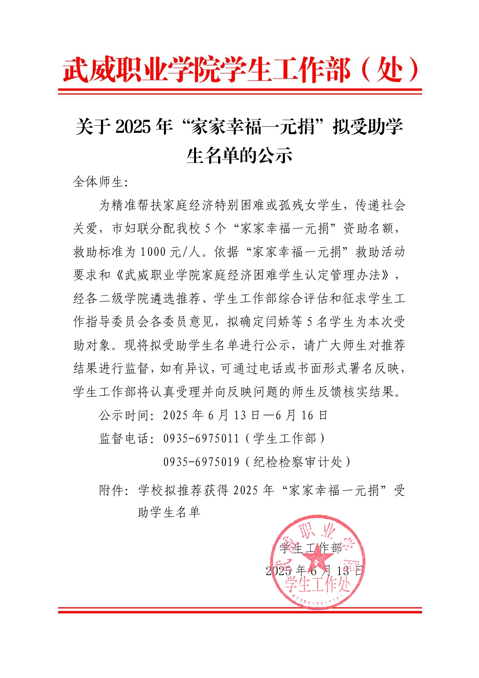 關(guān)于2025年“家家幸福一元捐”擬受助學(xué)生名單的公示