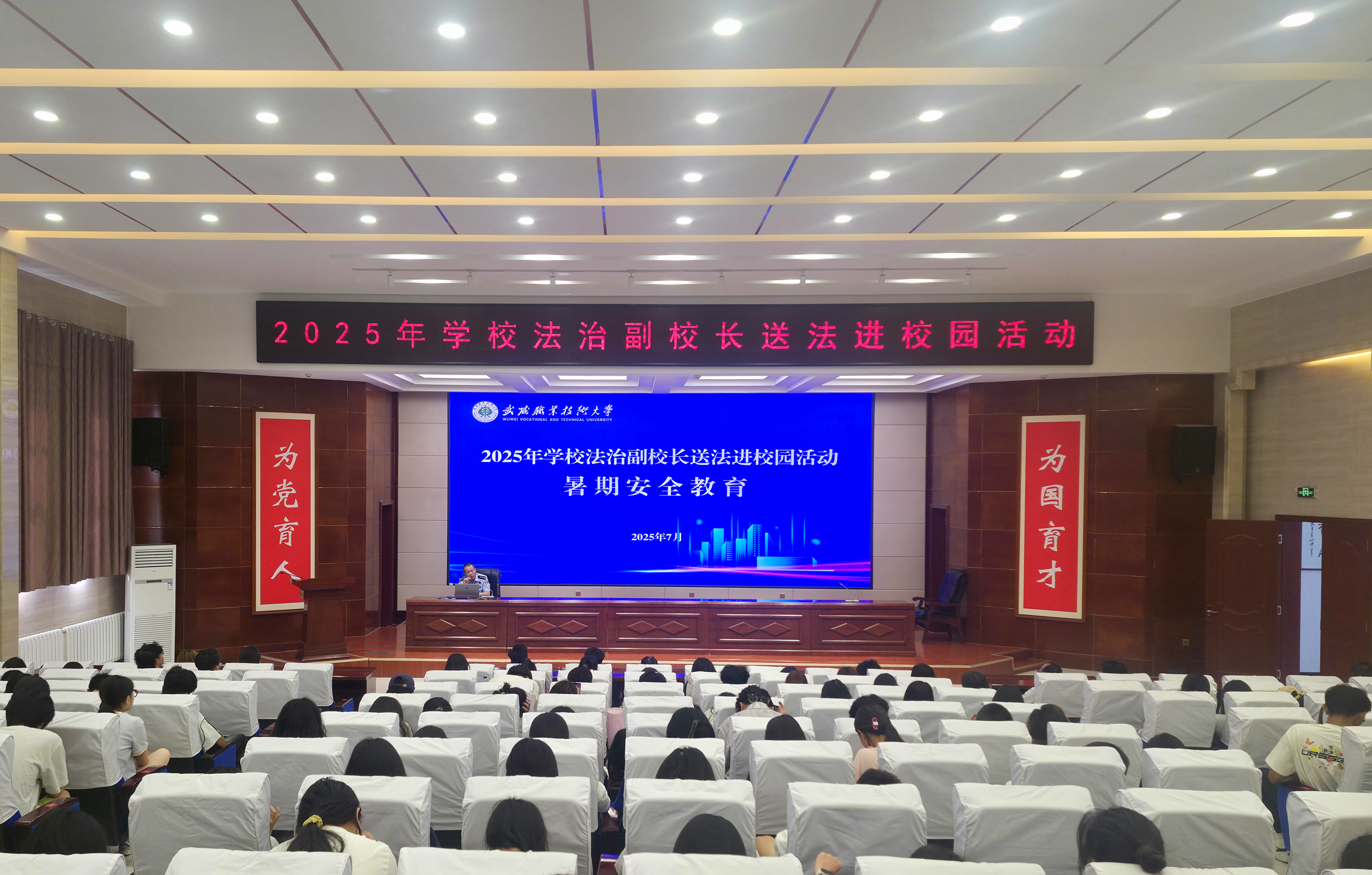 7月7日,學(xué)校法治副校長進校開展“送法進校園”宣講活動,旨在進一步提升師生安全防護與法治素養(yǎng),為暑期安全保駕護航。安全保衛(wèi)處、學(xué)生工作部負責(zé)同志及各學(xué)院輔導(dǎo)員、學(xué)生代表共200余人參加活動。?