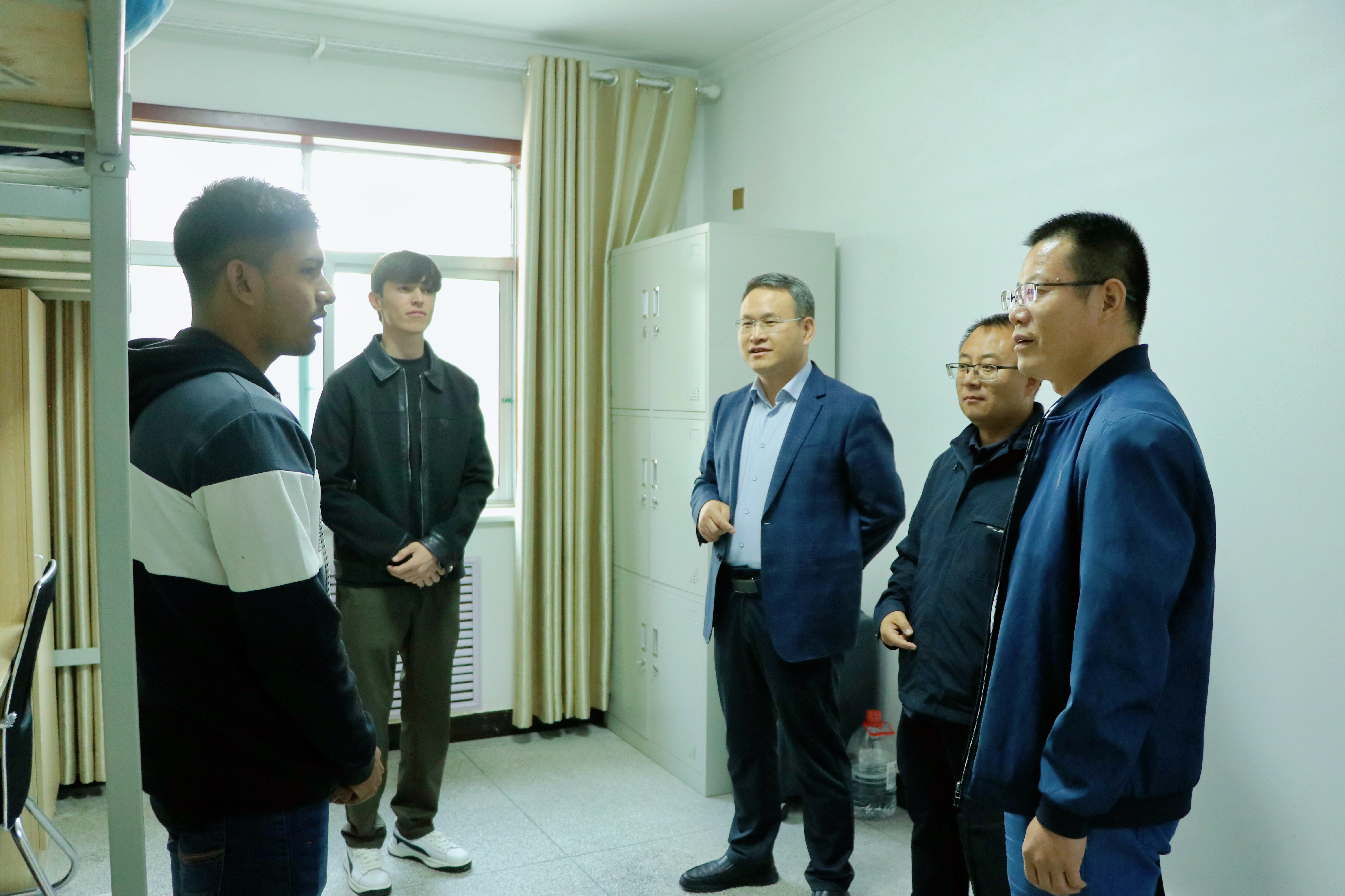 帶著學(xué)校對(duì)國(guó)際學(xué)生的深切關(guān)懷,伍國(guó)強(qiáng)一行逐一走訪了國(guó)際學(xué)生宿舍,查看、了解國(guó)際學(xué)生住宿、生活與學(xué)習(xí)情況,并代表學(xué)校對(duì)2025級(jí)新錄取國(guó)際學(xué)生表示歡迎,希望同學(xué)們珍惜來華學(xué)習(xí)的寶貴機(jī)會(huì),增強(qiáng)與老師的溝通交流,學(xué)好專業(yè)理論知識(shí),增強(qiáng)技術(shù)技能本領(lǐng),同時(shí)積極學(xué)習(xí)中華優(yōu)秀傳統(tǒng)文化,做好中外文化交流的使者。交流過程中,伍國(guó)強(qiáng)要求國(guó)際合作交流處提高管理能力,強(qiáng)化安全教育,增強(qiáng)服務(wù)意識(shí),為國(guó)際學(xué)生營(yíng)造一個(gè)安全舒適溫馨的居住環(huán)境,確保國(guó)際學(xué)生學(xué)習(xí)生活安全穩(wěn)定。