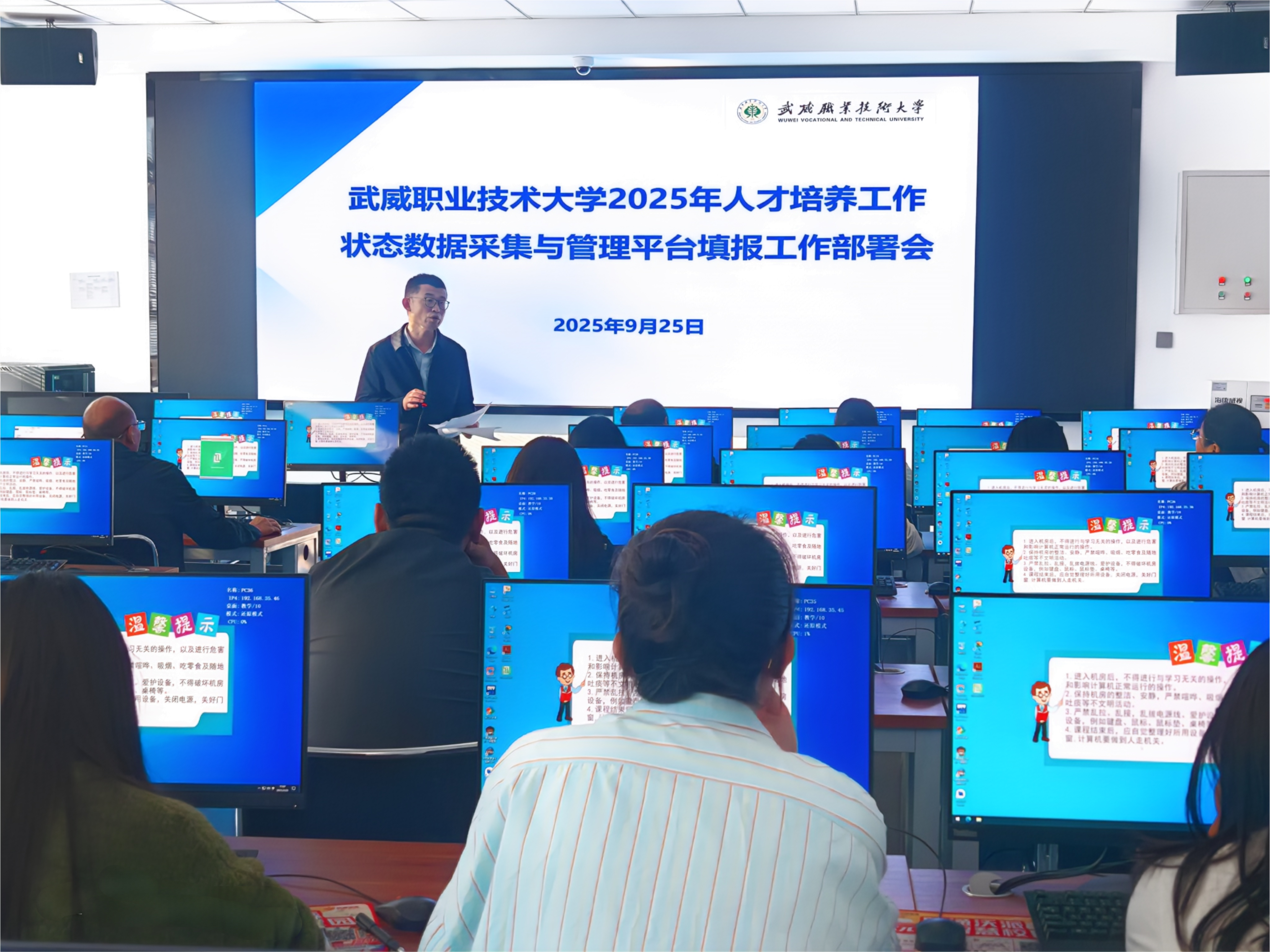 為深入貫徹落實(shí)教育部職成司《關(guān)于做好職業(yè)教育2024-2025學(xué)年數(shù)據(jù)采集工作的通知》精神,根據(jù)《甘肅省教育廳關(guān)于開(kāi)展全省職業(yè)教育2024—2025學(xué)年信息數(shù)據(jù)采集工作的通知》要求,確保學(xué)校2025年人才培養(yǎng)工作狀態(tài)數(shù)據(jù)采集工作高效、有序開(kāi)展。9月25日,教務(wù)處在篤行樓3樓機(jī)房組織召開(kāi)學(xué)校2025年人才培養(yǎng)工作狀態(tài)數(shù)據(jù)采集工作部署會(huì)議。教務(wù)處、各學(xué)院(部)數(shù)據(jù)填報(bào)相關(guān)工作人員參加會(huì)議。