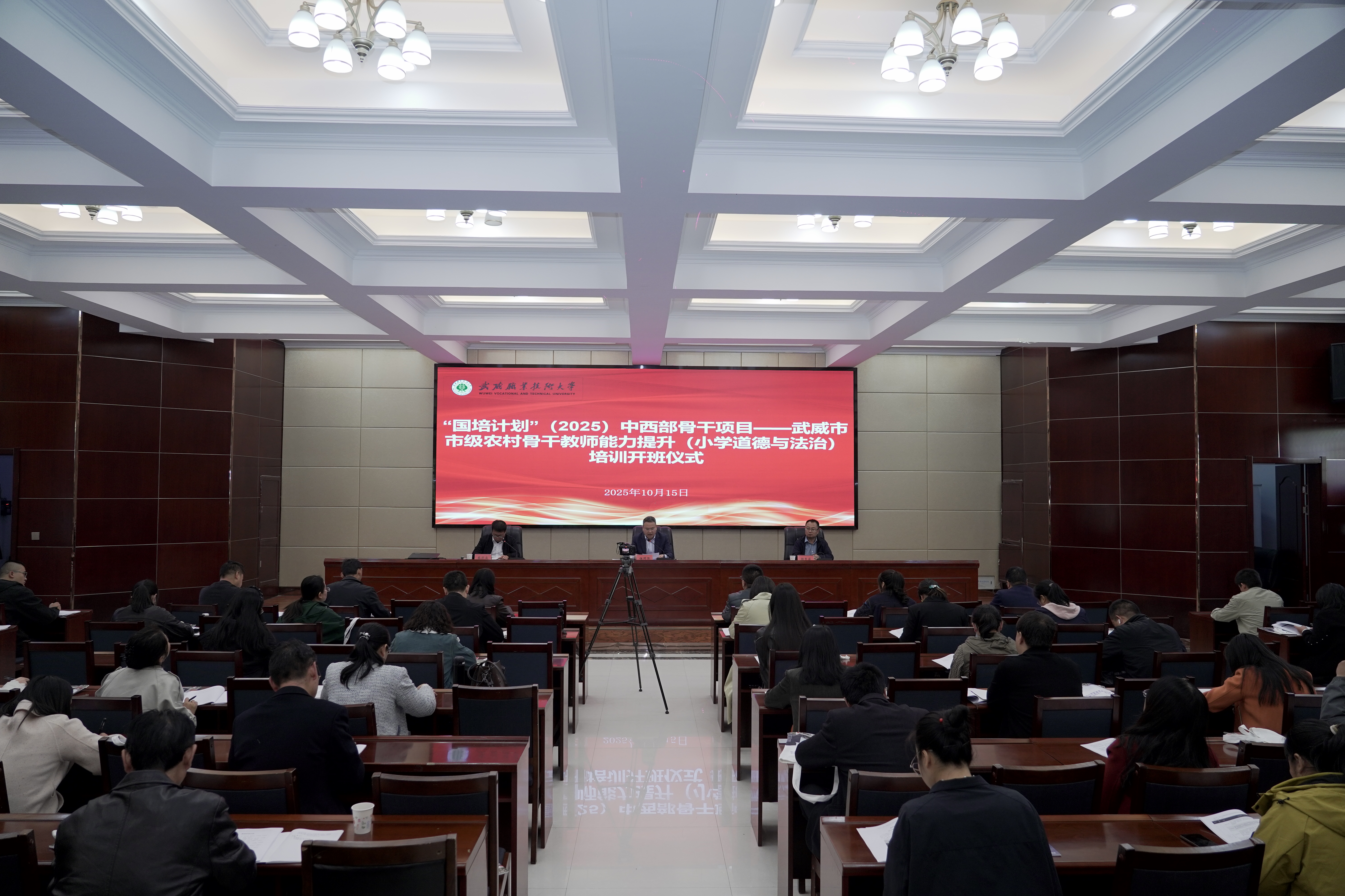 10月15日,由武威市教育局主辦、武威職業(yè)技術(shù)大學(xué)承辦的“國培計(jì)劃”(2025)中西部骨干項(xiàng)目——武威市市級農(nóng)村骨干教師能力提升(小學(xué)道德與法治)培訓(xùn)班在學(xué)校行樹樓北側(cè)報(bào)告廳正式開班。學(xué)校黨委委員、副校長伍國強(qiáng)出席開班儀式。培訓(xùn)組織管理工作人員及60名參訓(xùn)骨干教師共同參加。開班儀式由學(xué)校國際合作交流處副處長蔡濟(jì)眾主持。
