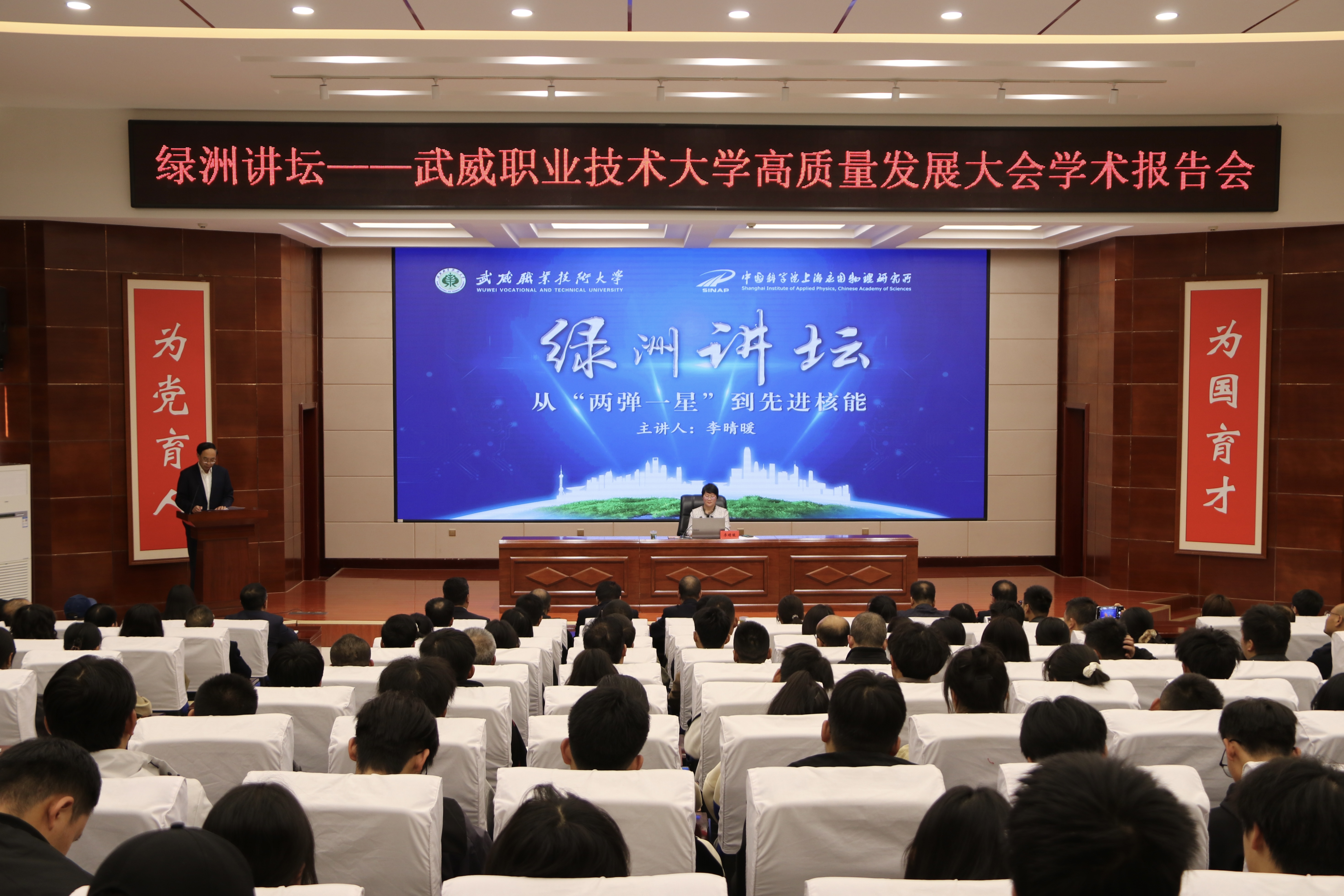 10月12日下午,中國科學(xué)院上海應(yīng)用物理研究所黨委書記、副所長李晴暖研究員,受邀做客武威職業(yè)技術(shù)大學(xué)“綠洲講壇”,以《從“兩彈一星”到先進(jìn)核能》為題,為該校220余名師生代表帶來專題學(xué)術(shù)報(bào)告。