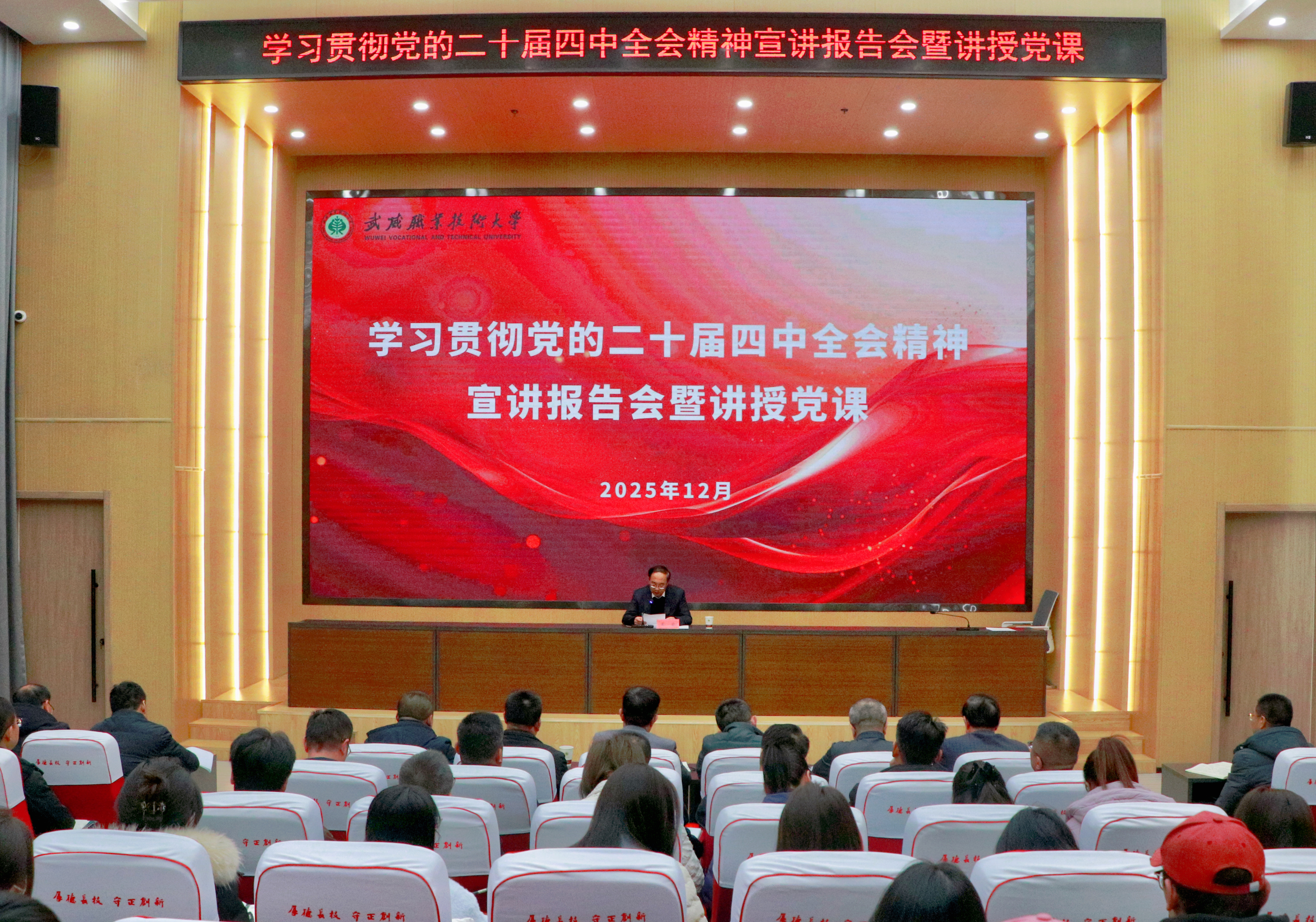 12月10日,黨委書記王宏專題宣講黨的二十屆四中全會(huì)精神,并向師生講授黨課。他強(qiáng)調(diào),要深入學(xué)習(xí)貫徹黨的二十屆四中全會(huì)精神,全面把握核心要義,立足職業(yè)本科教育新起點(diǎn),奮力譜寫學(xué)校高質(zhì)量發(fā)展新篇章,為加快推進(jìn)中國式現(xiàn)代化武威實(shí)踐貢獻(xiàn)智慧力量。黨委副書記、副校長張開禮主持報(bào)告會(huì)。