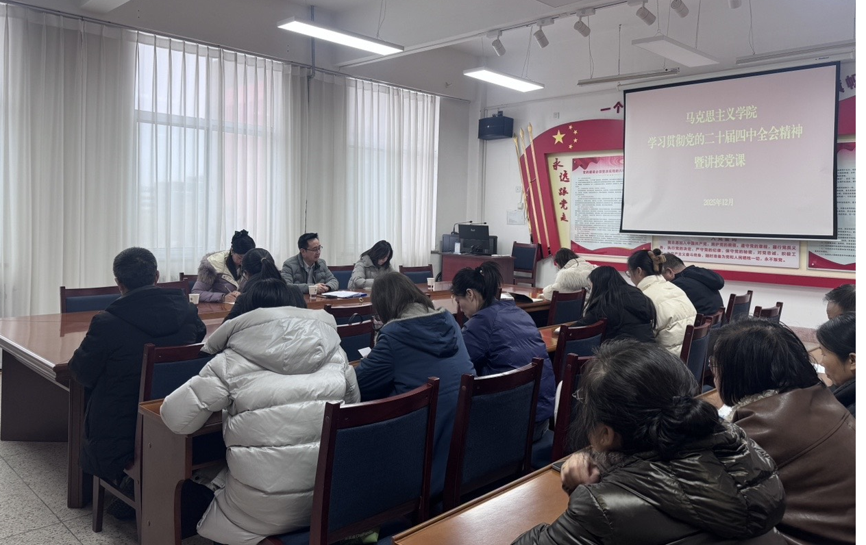 為推動(dòng)黨的二十屆四中全會(huì)精神在學(xué)院落地生根,進(jìn)一步統(tǒng)一思想、凝聚共識(shí)、激發(fā)干勁,12月31日,馬克思主義學(xué)院開展深入學(xué)習(xí)貫徹黨的二十屆四中全會(huì)精神專題學(xué)習(xí)活動(dòng),學(xué)院黨總支書記任陶在勵(lì)勤樓209會(huì)議室講授專題黨課,全體教師參加。