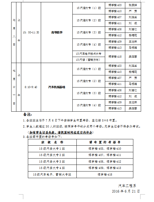 汽車(chē)工程系2015-2016學(xué)年第二學(xué)期期末考試實(shí)施方案