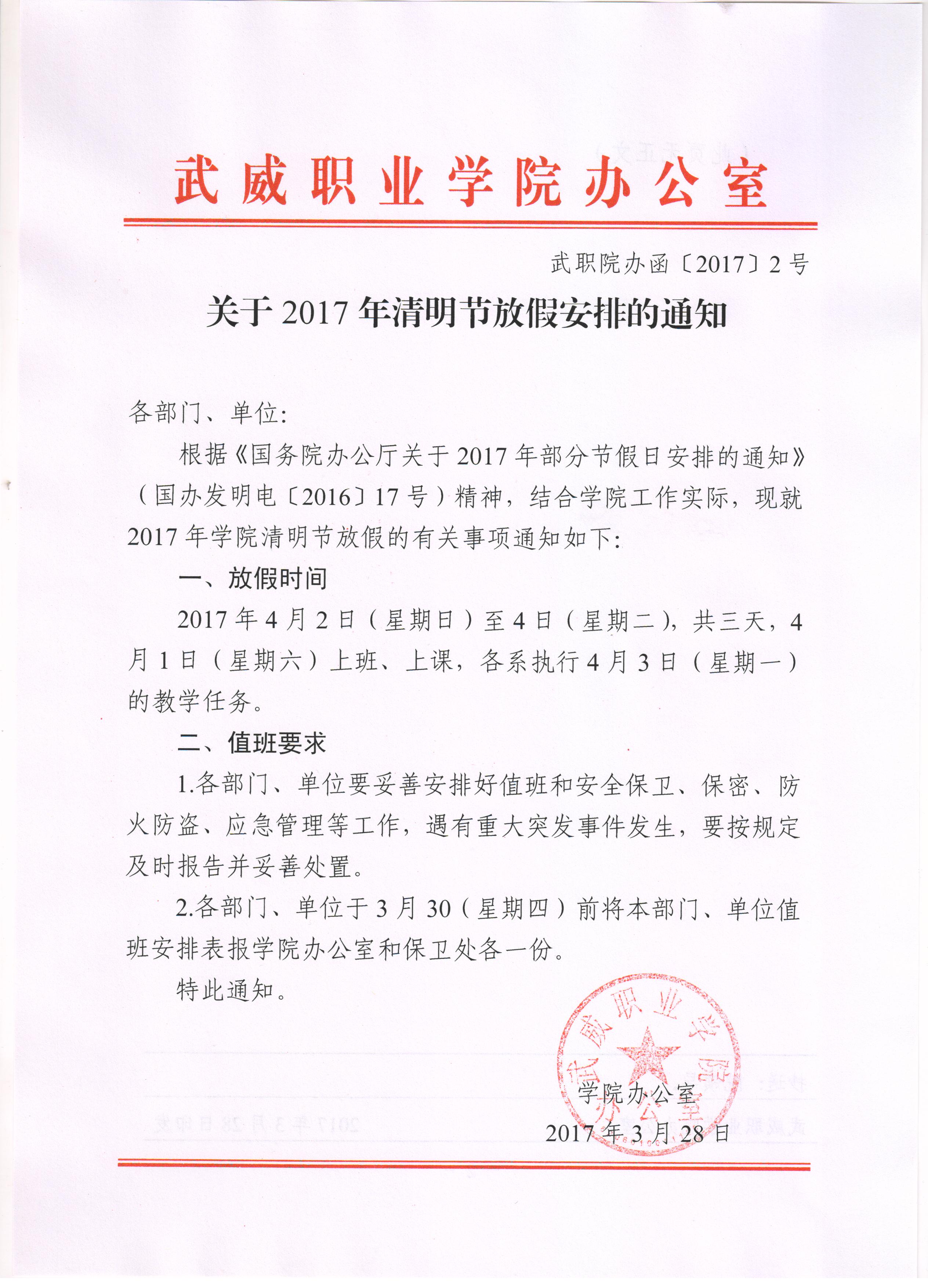 關(guān)于2017年清明節(jié)放假安排的通知