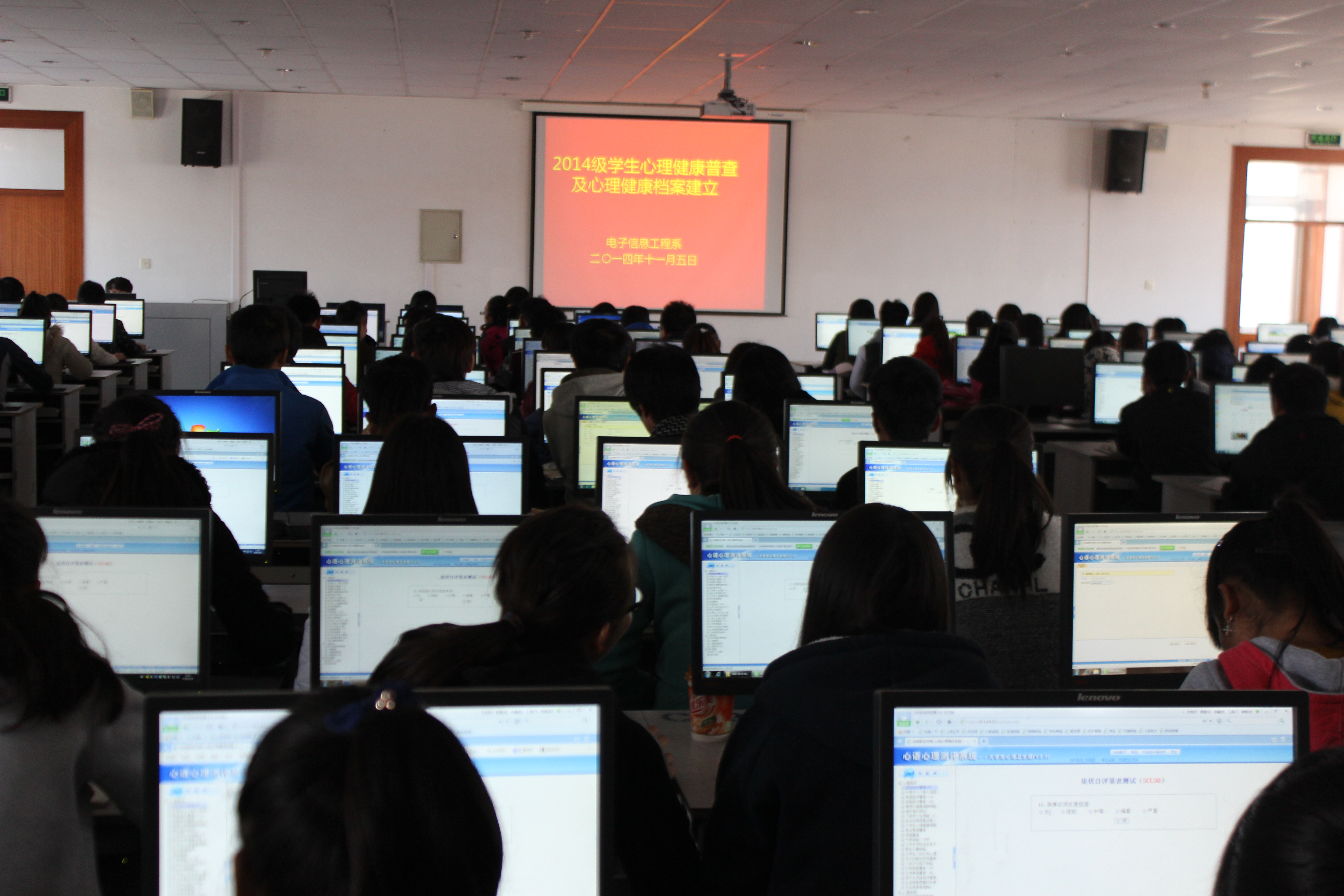 為及時(shí)掌握2014級學(xué)生的心理健康狀況,有針對性地進(jìn)行心理健康教育,按照學(xué)院心理健康普查安排及要求,11月5日12時(shí)10分,我系組織2014級學(xué)生完成了心理健康狀況普測工作,并為每個(gè)同學(xué)建立了心理健康檔案。
