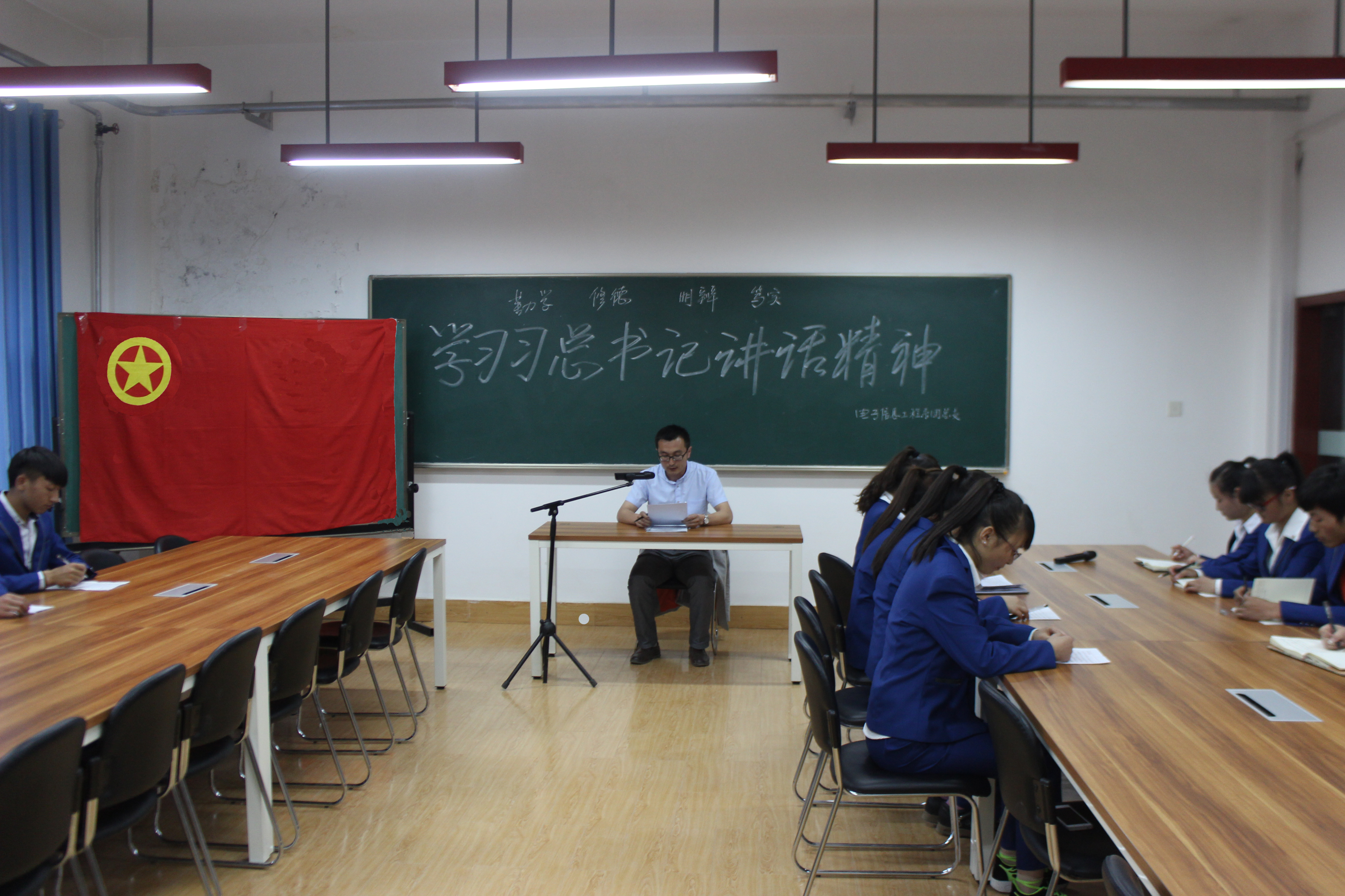 為使學(xué)生更好地學(xué)習(xí)和踐行習(xí)近平總書記的系列講話精神,牢固同學(xué)們對黨的科學(xué)理論的信仰,電子信息工程系團總支于2015年5月5日在尚德樓5樓計算機教研室開展學(xué)習(xí)習(xí)近平總書記講話精神“四進四信”活動暨“如何練好習(xí)大大傳授的‘八字真經(jīng)’”主題團日活動,活動由電子信息工程系團總支書記唐宗舜老師主持,各班團學(xué)干部參加活動。