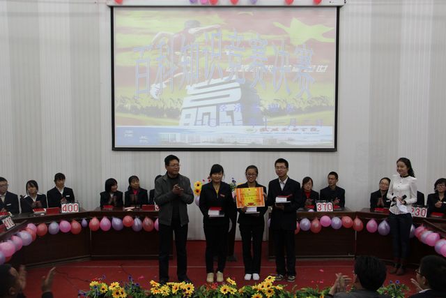 競賽結(jié)束后,王院長揭曉了本次比賽的全部獎項,并對比賽中各代表隊的不俗表現(xiàn)給予了高度評價。他認(rèn)為經(jīng)濟管理系本次“百科知識競賽”集知識性與趣味性于一體,既豐富了學(xué)生的課余生活又拓寬了學(xué)生的知識面,在大學(xué)校園中非常必要,以后要多舉辦類似的活動。隨后,經(jīng)管系黨總支白書記作了總結(jié)講話,白書記首先對本次競賽取得圓滿成功表示祝賀,向在百忙之中抽出時間來參加活動的領(lǐng)導(dǎo)及老師表示衷心的感謝,并對本次組委會師生付出地辛勤勞動予以肯定!白書記希望,全體同學(xué)能以此次知識競賽活動為契機,勤奮學(xué)習(xí)、苦練技能,奮力拼搏,成為優(yōu)秀的應(yīng)用性人才。