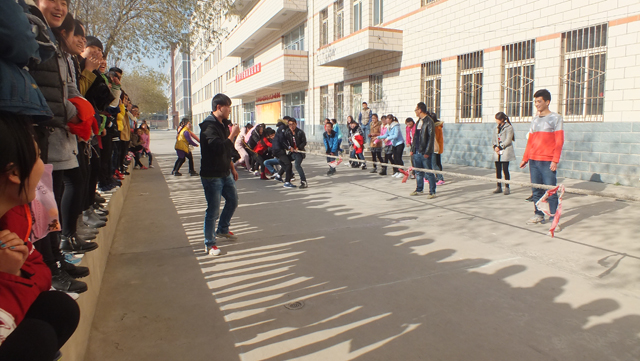 隨著蔡柱山宣布運動會正式開始的指令發(fā)出,拔河決賽立刻在熱烈的氣氛中拉開了架勢,進入決賽的班級在裁判的指導下迅速進入指定位置,各班同學紛紛加油助威,運動場上氣氛頓時被調動起來了。根據(jù)賽程安排,籃球賽、“15人跳繩”、乒乓球賽等集體和單人的各項比賽依次有序進行,特別是跳繩比賽,參與面廣,同學們都積極投入其中,感受到運動的樂趣和團結的力量。