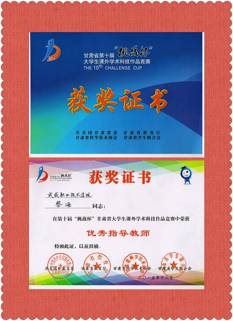 2015年6月23日,現(xiàn)代農(nóng)業(yè)技術(shù)系教師蔡海、李強棟赴西北師范大學(xué),參加由共青團甘肅省委、甘肅省教育廳、甘肅省科學(xué)技術(shù)學(xué)會、甘肅省學(xué)生聯(lián)合會舉辦的甘肅省第十屆大學(xué)生“挑戰(zhàn)杯”大學(xué)生課外學(xué)術(shù)科技作品競賽,獲得優(yōu)秀指導(dǎo)教師榮譽稱號。
