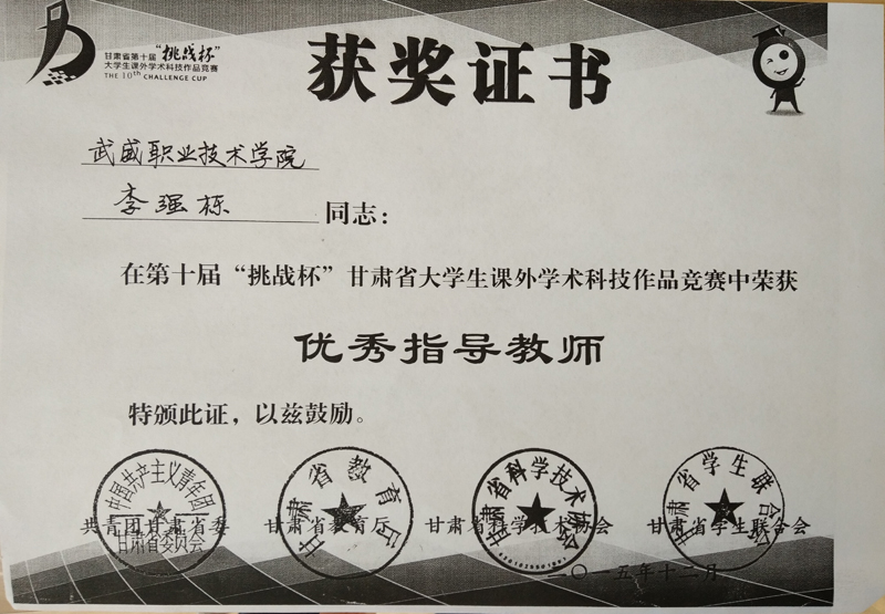 我院教師獲得甘肅省第十屆大學(xué)生“挑戰(zhàn)杯”大學(xué)生課外學(xué)術(shù)科技作品競賽優(yōu)秀指導(dǎo)教師榮譽稱號