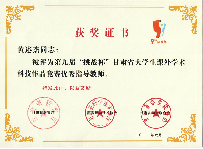 黃述杰榮獲第九屆“挑戰(zhàn)杯”甘肅省大學生課外學術科技作品競賽優(yōu)秀指導教師