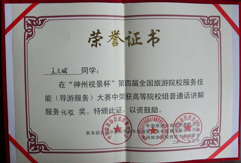 學(xué)生王文斌、凌小花、成玉玲榮獲“神州視景杯”第四屆全國(guó)旅游院校服務(wù)技能(導(dǎo)游技能)大賽優(yōu)秀獎(jiǎng)。