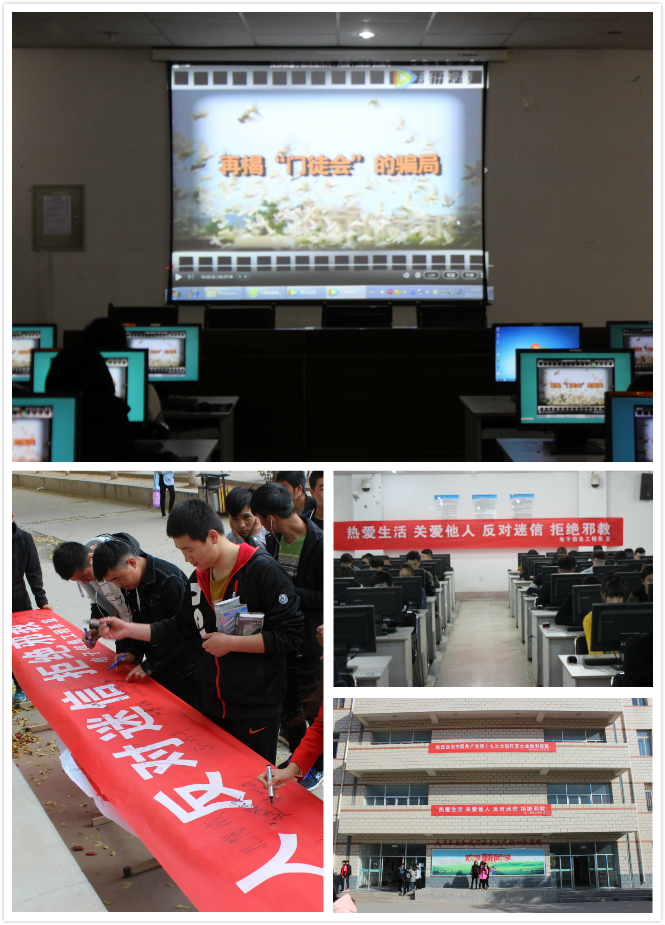 為了建設(shè)和諧校園,維護(hù)社會(huì)穩(wěn)定,凈化教育系統(tǒng)校園,電子信息工程于10月30日晚,在尚德樓11號(hào)機(jī)房開展了反邪教宣傳片放映活動(dòng)。