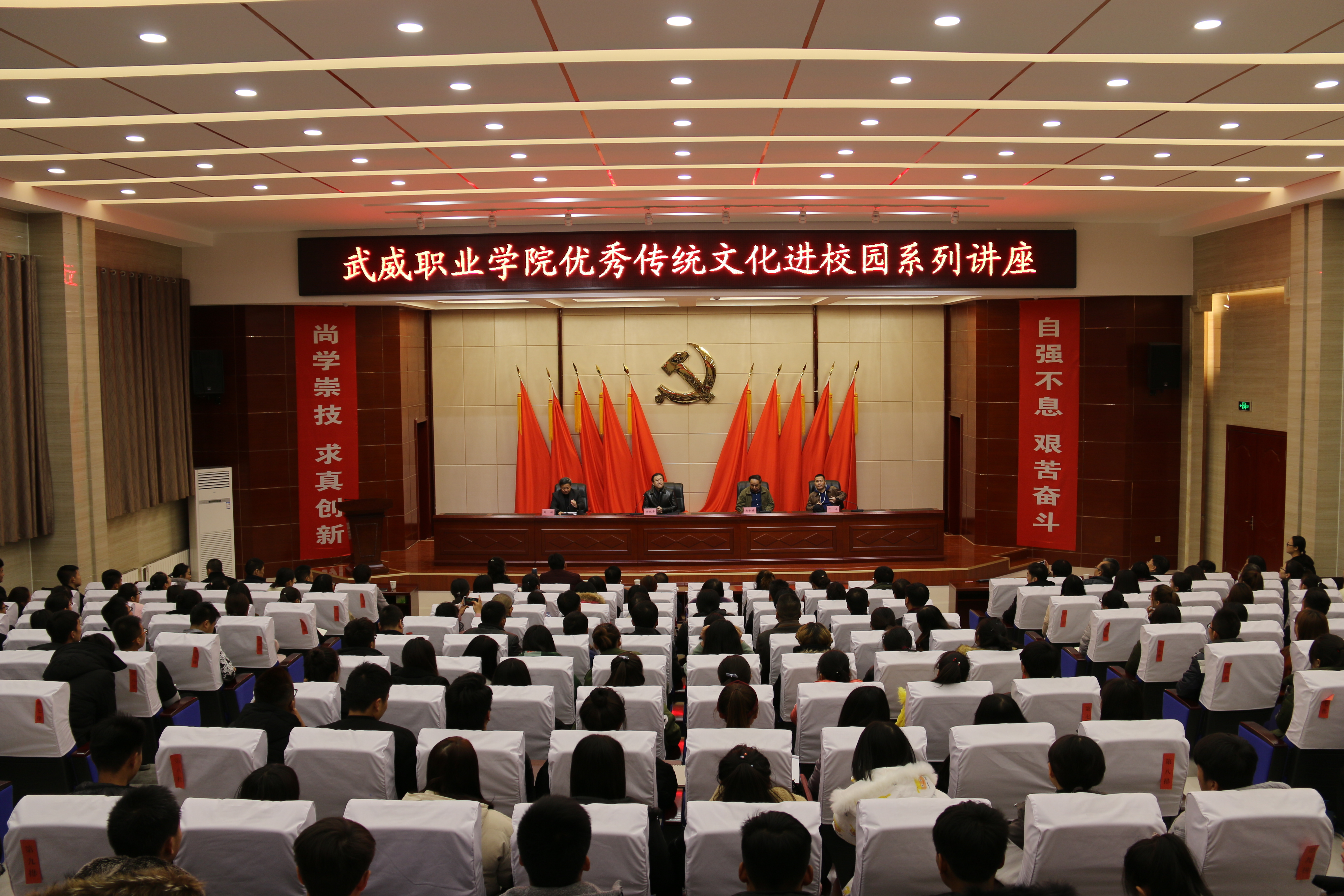 為貫徹落實(shí)《甘肅省實(shí)施中華優(yōu)秀傳統(tǒng)文化傳承發(fā)展工作方案》,推進(jìn)優(yōu)質(zhì)高等職業(yè)院校的建設(shè),加強(qiáng)傳統(tǒng)文化和校園文化相融合,提升校園文化軟實(shí)力,11月22日,學(xué)院在大學(xué)生活動(dòng)中心菁英廳舉辦優(yōu)秀傳統(tǒng)文化進(jìn)校園活動(dòng)?;顒?dòng)邀請(qǐng)了西部著名作家、西北師范大學(xué)傳媒學(xué)院院長(zhǎng)徐兆壽,甘肅省作家協(xié)會(huì)主席、甘肅省社科院文化研究所所長(zhǎng)馬步升和甘肅省作協(xié)副秘書(shū)長(zhǎng)、70后新銳作家弋舟三位學(xué)者以“鳩摩羅什與涼州文化”為主題進(jìn)行了系列講座。學(xué)院黨委副書(shū)記趙明主持活動(dòng),學(xué)院師生共260余人聆聽(tīng)了講座。